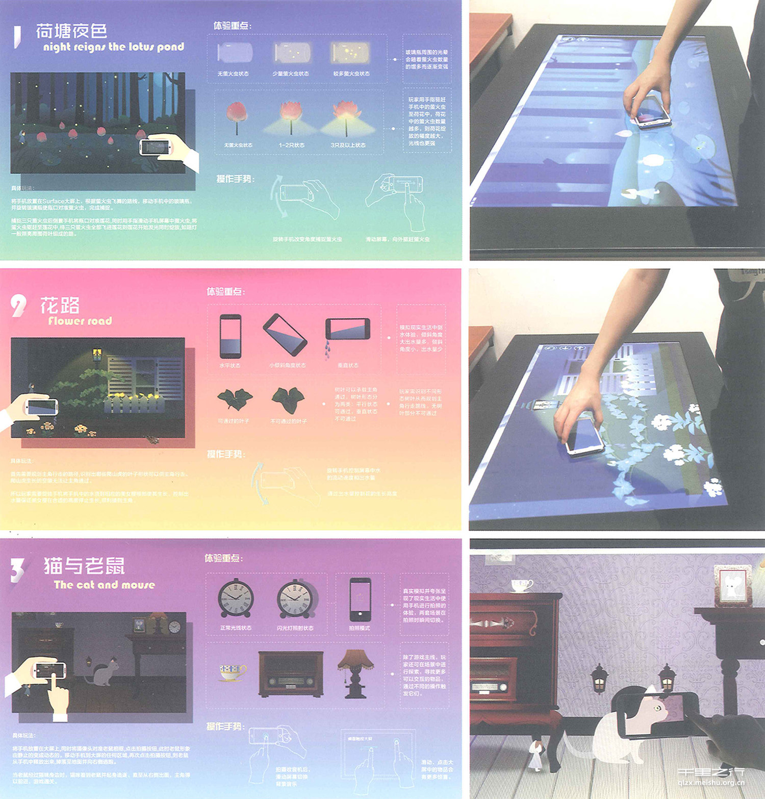 高艳玲的毕业设计以手机与大屏互动的技术为平台,以解谜游戏为形式构建了一个“童话之 境”。在设计过程中,高艳玲积极进行了多种探索,对技术、游戏设计等进行了较为细致的研究和分析。其最终成果有一定创新性和良好的展不效果,具有完整的实现效果和稳定性,也反映出其良好的设计表达能力和专业水平。