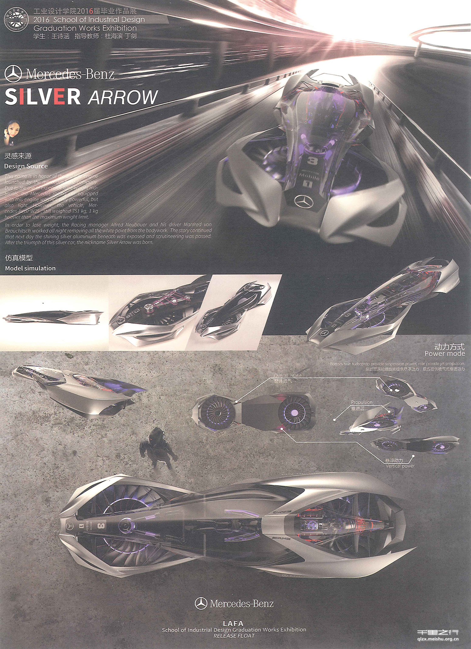 王诗涵同学的《Silver Arraw梅赛德斯奔驰无人驾驶飞行赛车》的造型具有很好的创新性和历 史延续性,通过加入碳纤维和石墨烯等高新材料以及先进动力技术的导入,使得飞行赛车兼顾了性能感和概念性,给人以前沿奢华的视觉感观。另外在内饰设计上,同样体现出细致而创新的态度,是一个相对完整且富有创新精神的本科生毕业设计作品。
