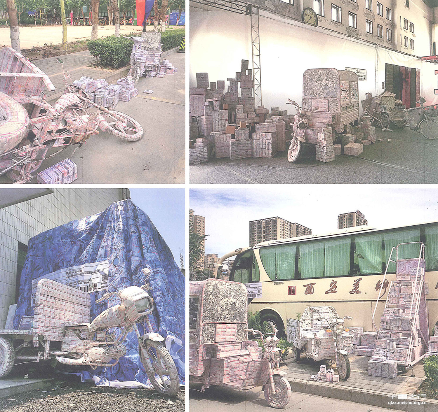 《快递-乡土中国》综合装置作品,以快递车和快递单为主要媒介材料来生动阐 释当代中国乡土文化的城市发展进程中的一个现象,由这个丰富和多元的绘画与空间的大型装置作品里,我们在获取大量丰富个人信息及购买途径的快递单里,仿佛看到一个充满夸张的巨大中国龙的意象,而由此我们联想到中国改革开放30余年来,中国社会所出现巨变腾飞的同时,也伴随着辛酸的苦力劳动和心灵无处安家的恐惧。