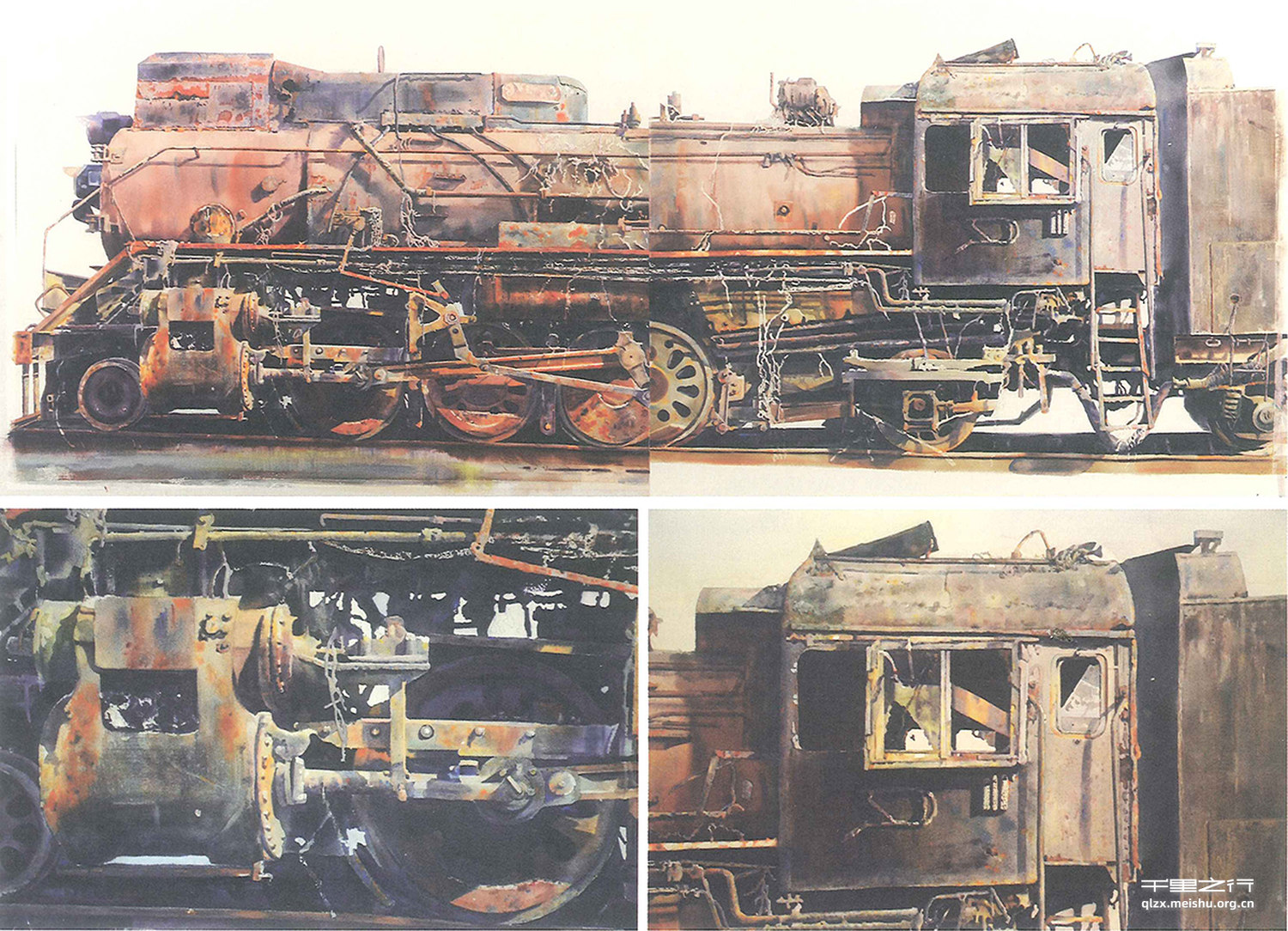 该创作来源于生活,生活是一切艺术创作的先导,水彩画创作也是如此。只有通过 深入生活,才能找到创作题材、创作素材和创作灵感。感受事物,是创作中必不可少的途径。该作品对水彩语言的运用比较到位,画面整体感强。整体是绘画的灵魂,该作品整个绘画过程是要以整体为主的,等大的画面关系基本确立,绘画的主体阶段基本完成,因为破旧的火车,斑斑驳驳,生锈的痕迹数不胜数,再加上时间的关系在第一遍湿画的时候,不可能做到满意,要使画面厚实,必须要叠加,但叠加时我尽力做到不腻,保持新鲜感,保持第一遍的活力和生动性,加强描绘画面的细节,做到丰富多变,又不失整体,反复调整各个部分之间的关系,做到有序多变,最后调整画面,做到火车的整体统一。