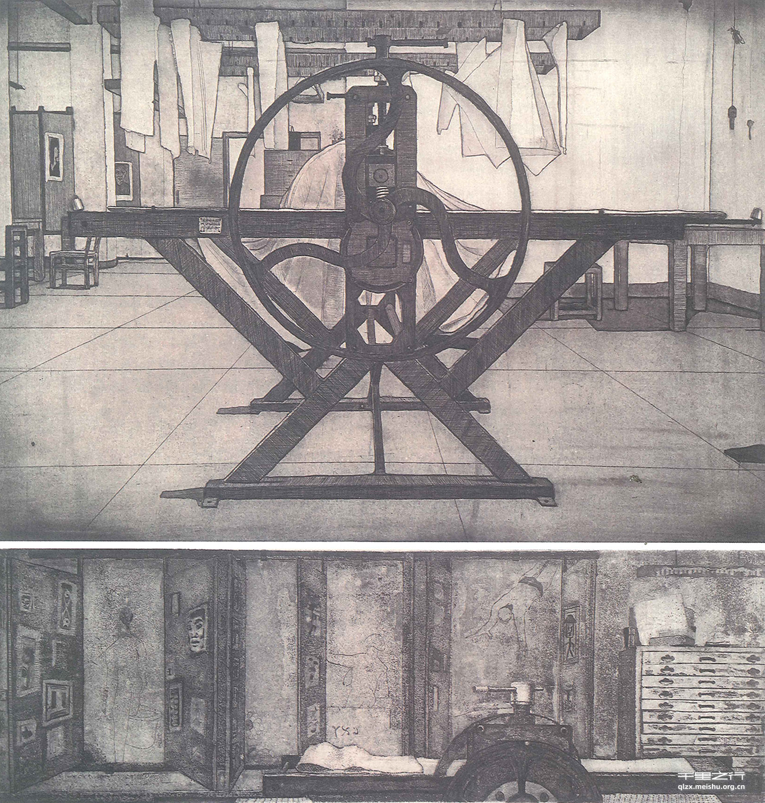 《画室系列》取材于我所生活的环境,这里是个安逸祥和、像庇护所的地方,把一份份关于 她的稿子转变为一张张铜版画,这其中包含着我对这里的留恋,对这四年的不舍。作品总体是在线腐蚀的基础上结合了多遍飞尘,又充分利用刮刀和压刀以及打点的方式,使得画面层次丰富,细节动人。我没有刻意去追求技术的精湛,我做的只是表达最原始的想法。