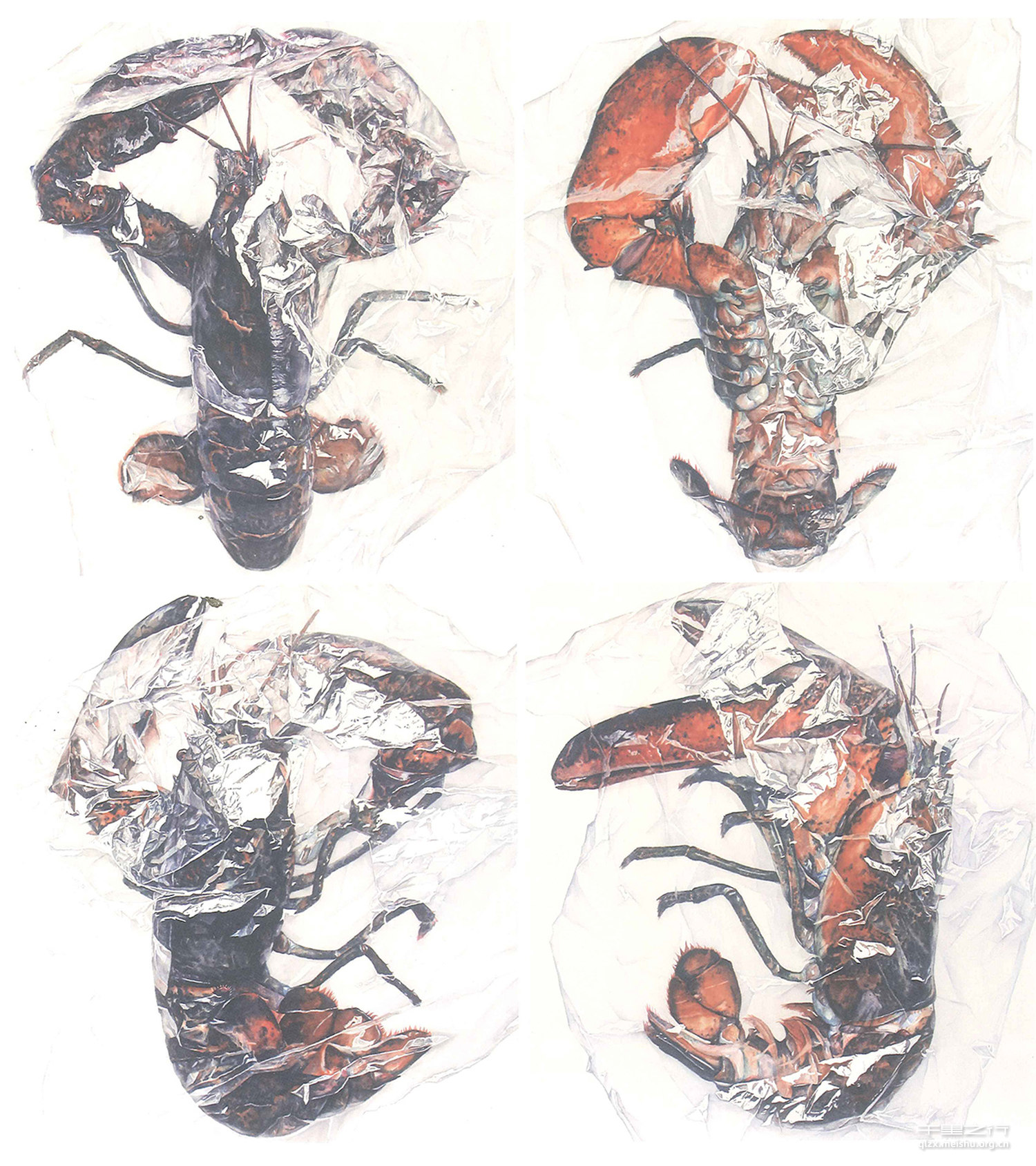 绘画创作体现着视觉经验的累积,以及在视界的扩展中不断寻求新的图式和风格语言的探求 过程,这是对内在意识和外在环境互动的一种感悟和提升。艺术带给人的精神世界是无法用语言描述清楚的,艺术创作是在一种可能性当中去感悟和做自我建构的一种表达。陈坤伦从自身对图像的视觉经验积累与感受中,把保鲜膜中的虾作为自己的一种创作依据和图像,运用水彩独具的艺术语言进行阶段性的创作实验与技艺语言之精准表达的一种探索。