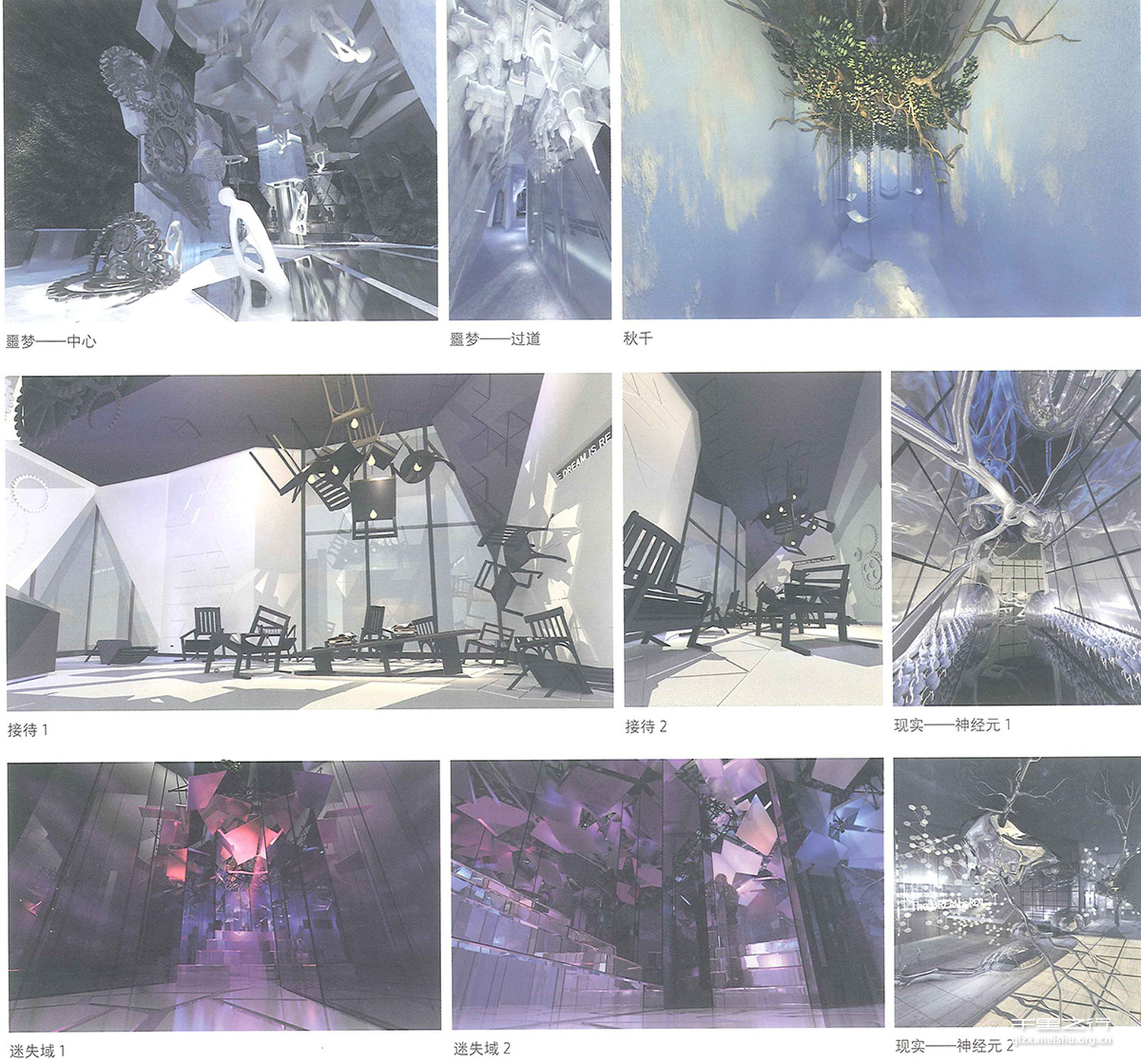 梦境是人的潜意识形态层面,是在现实生活中不可视的状态,而设计师经过自己 各方面的探索,参考梦学和经典电影去寻找尽可能让观众产生共鸣的方式,这个梦境体验空间追求的是强调人与现实还有梦境三者之间的联系。从现实中得出梦境的材料元素,又将梦境的探索结果从视觉上展示出来。然而这个体验空间可能更多带有作者自身的主观意识,因此如何更加贴切地传递信息,让更多观众有深刻感受,这也是值得思考的问题。