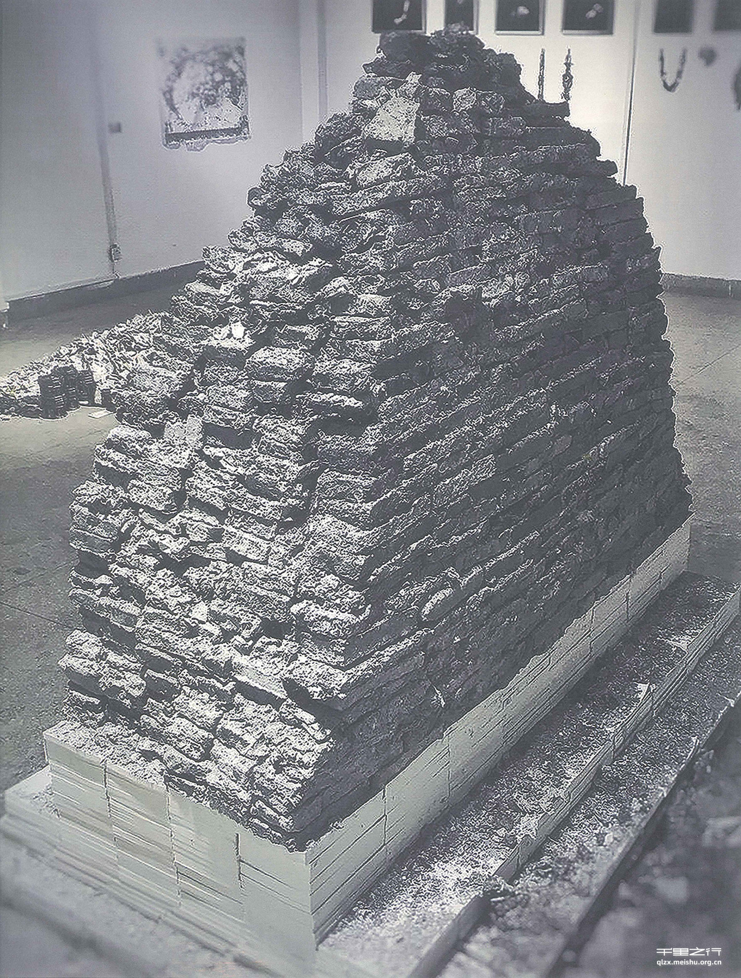 书为地基,书灰形成的砖以一种墓碑的形式展现。这种并不完整的墓碑像是在时间和岁月的 侵蚀下慢慢凋落,成为一座将要倒塌的墙。而这如同我们所接受的信息,亲手建起却又在时间中慢慢遗忘。选择这种材料是在一次偶然的机会中看到了一本燃烧过后的书,书的整体已然全部灰化,可文字却还零碎的保留着,这种材料很特别又让我感受到灰其实也是富有信息和含义的。