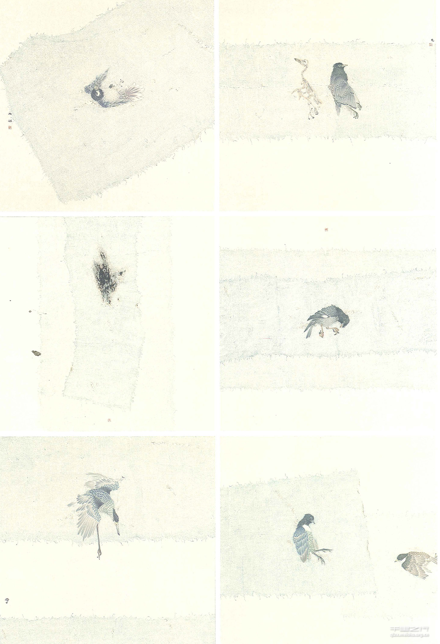 作品的创作手法是纸本设色,在传统绘画的基础上加以创新,在特定的宣纸上画出想要的效果。 这组作品一共有六张,共同反映了一个主题:人与自然的关系。同时也有潜在的人类之间的不和谐。六张作品中有一张是被火烧过之后留下的一个鸟的形状,这张点明了主题。人类作为高智商的生物,有着各种各样的思想但大多数人利用自己的贪欲,把它无限地放大,去永无止境地索取大自然。滥砍滥伐,大量捕杀动物,把它们的皮毛扒下来满足自己的虚荣心。当这样的情况永无止境地发展下去,树也没了、鸟也没了。等大自然没了,留下的还有什么7一个被烧焦的痕迹么7像那死去鸟儿下面的丝网,当你抽去一根丝,可能当时看不出来什么,但是当你抽完一根再抽一根,就这样永无止境地抽下去,就什么也没了。人与自然也是一样,只有和平共处、相互尊重才会永存下去。但是不和平的事情一直都存在在我们身边,战争、爆炸、大火、废墟和恐惧。希望我的作品能给观者带来那么一些感受,多些相互的尊重。