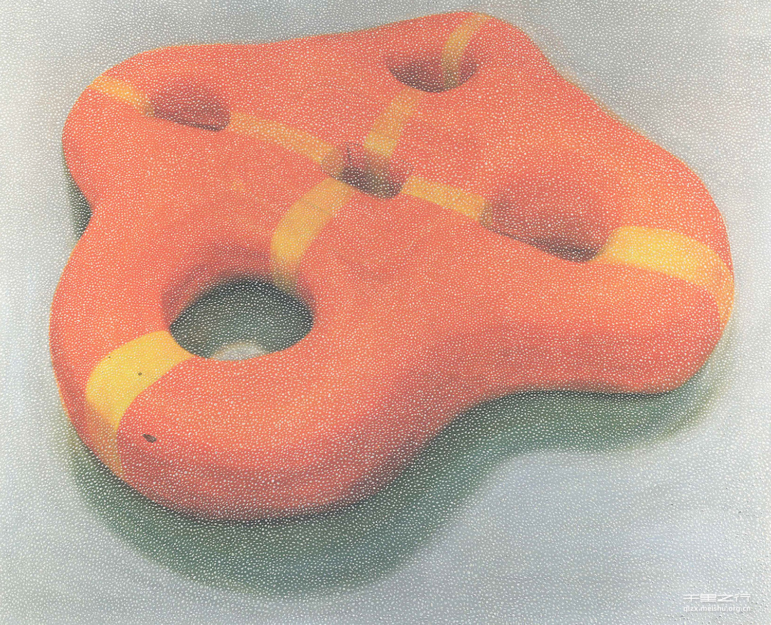 理解智豪的毕业创作有两种方式:一是透过形式看内容,二是透过内容看形式。一旦当我们 试图解读智豪毕业创作中的精神指向的时候,似乎很容易忽视其作品中更为本质的艺术气息:作者用无数的小白点企图过滤掉四人泳圈实际功能的表层意义,而突出其直观的艺术视觉效果。