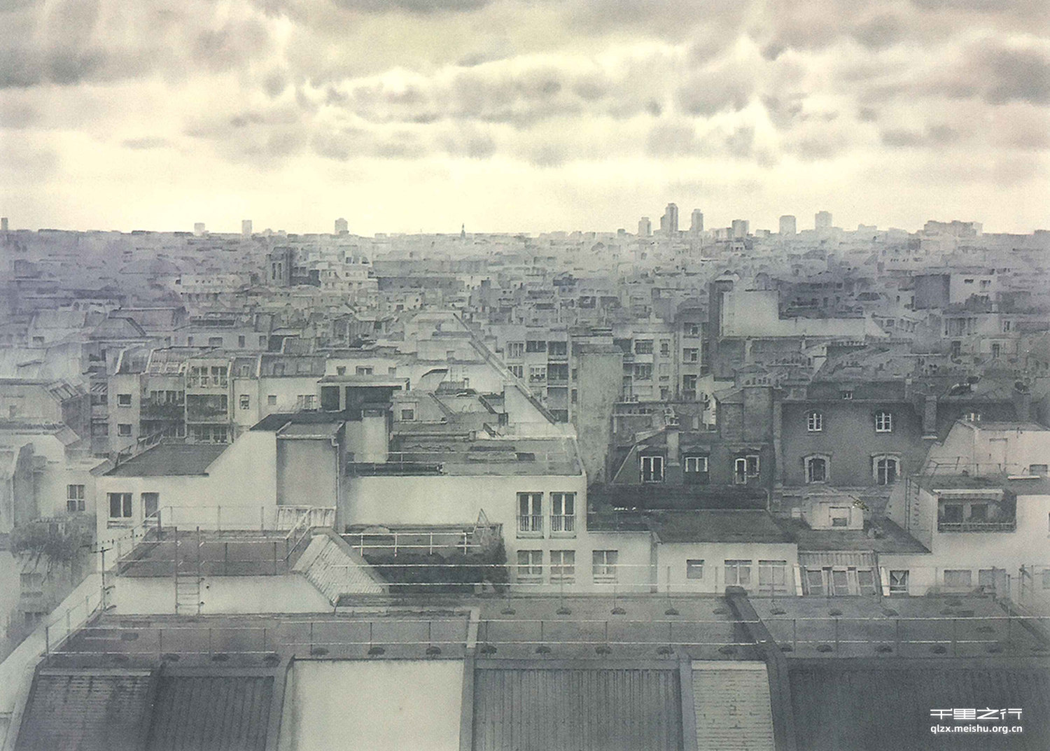 作品素材来源于去年9月份法国巴黎游学时拍摄的在高楼上俯瞰巴黎全景的照片。冷暖的对 比加大了画面的空间感与纵深感,也极大丰富了画面的灰色层次。我把这幅作品取名为《暮^光之城》,一方面是因为画面的整体颜色与氛围有一种日暮的感觉,另一方面是画面带给人