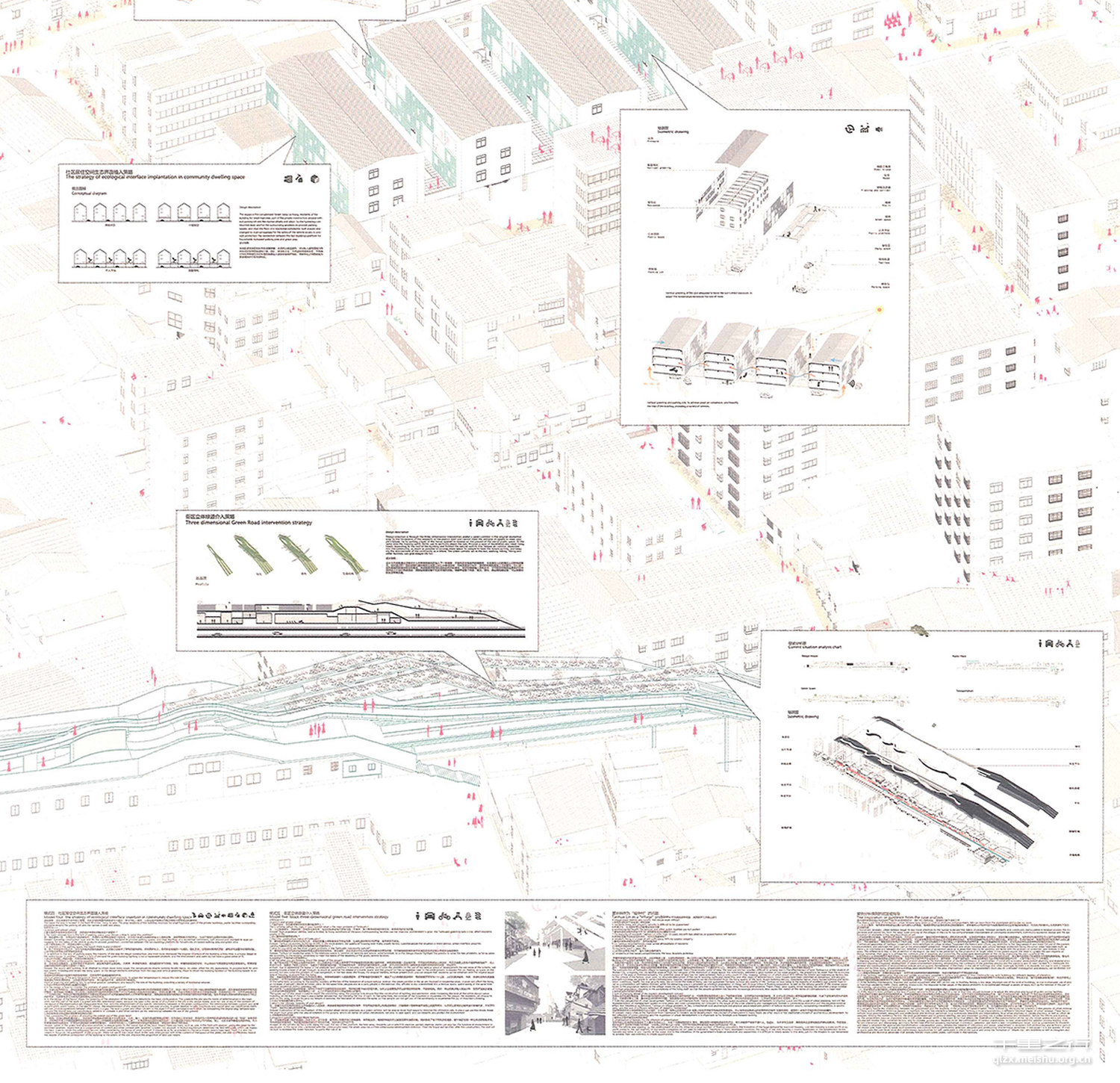 昙华林是武汉最具拼贴性”的城市区域,其居住的边缘性与地理中心性之间的 对抗充满戏剧性,而它肌理的背后激荡着多种社会演变的动因。该设计正是选择这一复杂而不确定的命题,通过调研及相应的策略研究,形成了多重参与、社区复兴、城市共享的行动主旨。方案以新城代谢”为建造原则,并通过五种代表性模式的研究,在该区域形成了颇有实践意义的城市行动计划。