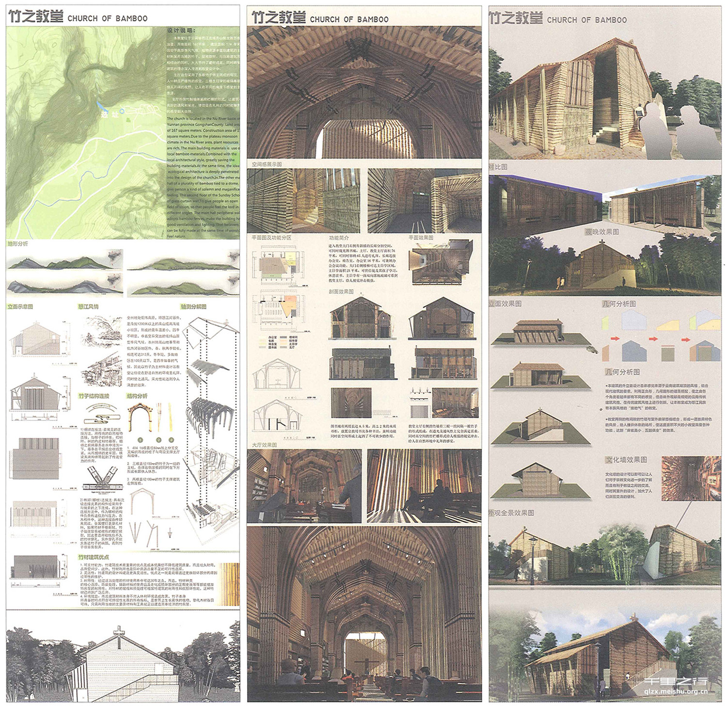 教堂整个正面与背面结合正负形的理念设计,不是由一块整墙组成而是由各种几何图形相互 错落而成,教堂正面与背面看起来是一个朴实的坡顶建筑。各个角度看却是大有干坤。整个教堂建筑用材为毛竹,这使教堂更能融入云南风貌的同时,又深化了生态建筑的理念。突出结构美。