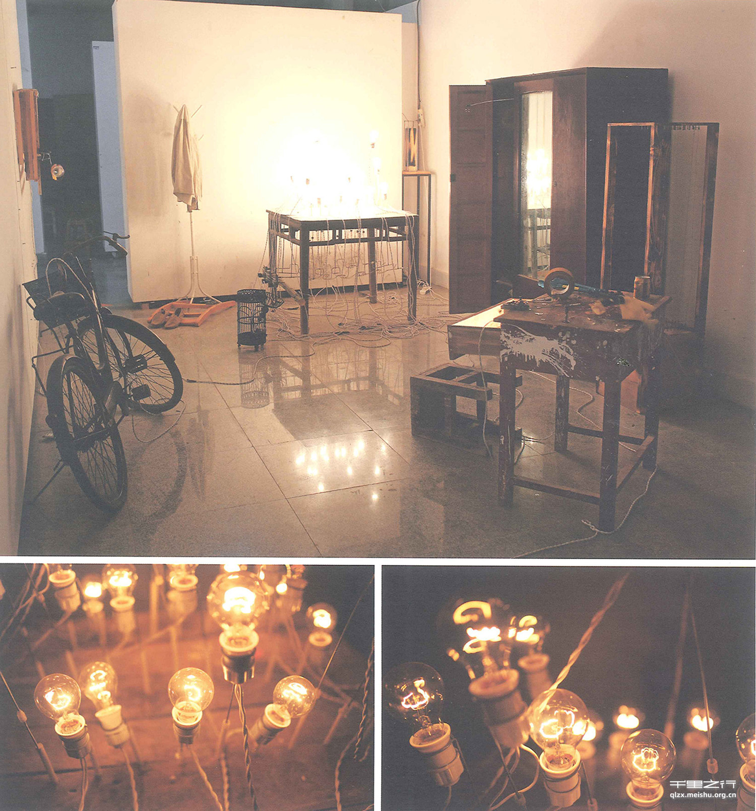 我对工业技术和各种机械非常感兴趣,所以制作了能够运动的装置,其中机械传动零件全部 都是用铁丝手工制作的,加工这些零件花了很大的工夫,老家具是在学校对面的栗庙村里挨家挨户收购到的,可以说这套作品也承载着和湖北美院对面栗庙村的一点点过往。