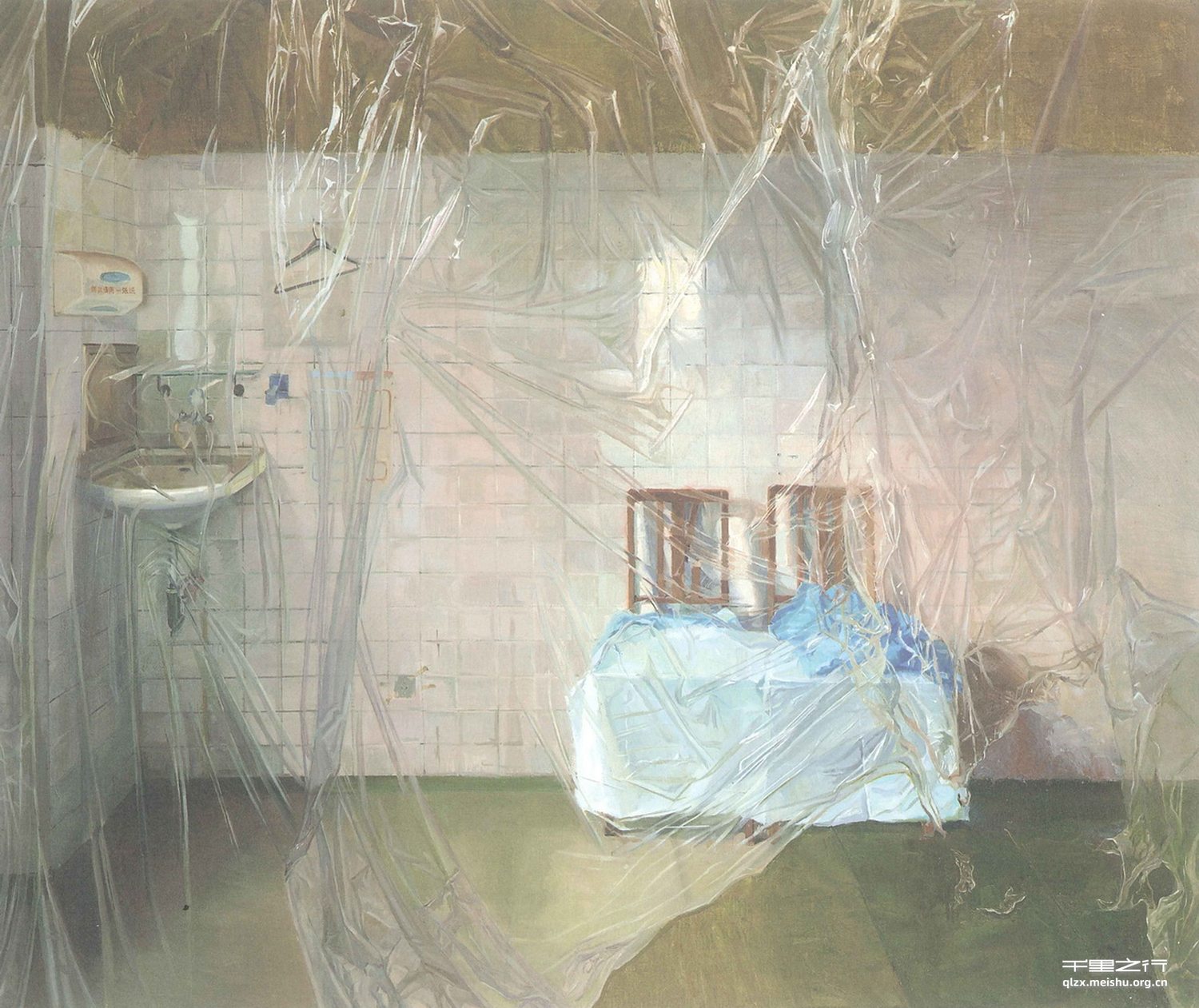 张如雪同学的毕业作品画了一组房间,似乎是在医院的环境中我们隔着一层打绉的塑料布似乎在梦中,感受着布绉后面的僵冷及淡淡的悲伤!其实借助环境她表达了一份心境,当然好画是有不同经历眼光的人才能读出丰富的语境,我看《空房间》这组画好和妙都在这个空字上,留给人想读的空间。另外今天的油画受到大量图片照片的影响,当然也给绘画有新的可能。如雪的这组画明显的不全是肉眼所观所感,有图片的借助,但转换的很好,有图片的隔模生硬也有绘画的丰富自然,运用的恰到好处。这组画面记录着她的努力,也祝福她艺途长久!——洪凌新一代的人生似乎充满了各种不确定的可能,留学或移民。在丰富开放的选择面前反而迷茫而无根了,看不清这选择对未来的深远影响。于是,只有这肉身是确切实在的吧!作者去医院时的目光留驻清冷的角落。潜在的焦虑暗藏在那些空间背后。透明纠缠的塑料薄膜带着某种无法轻易摆脱的情绪。而这种视觉的外化是否疗愈了作者不安的内心呢?——陆亮