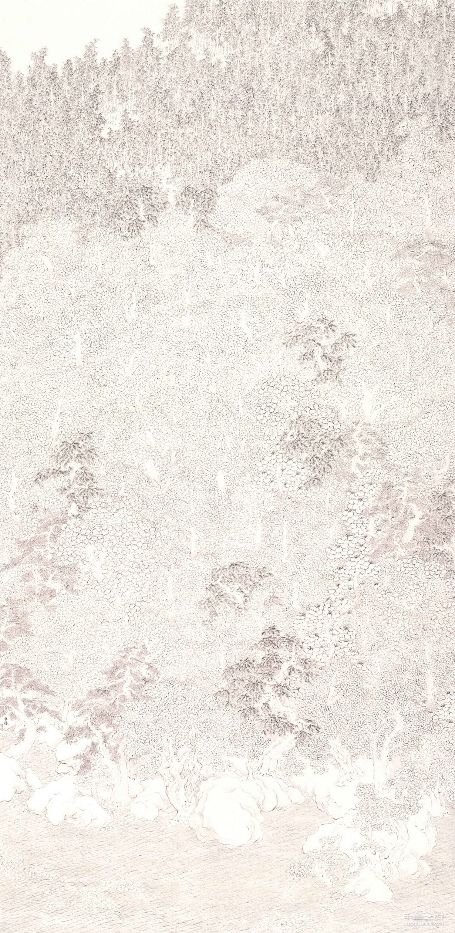 《双林重荫图》描绘的是盛夏之季,百木苍郁之景。于近处作细风吹拂之下波光涟漪一片,亦有几叠落叶漂浮其上,临畔有空勾无皴略加淡墨以分向背的巨石,石罅间有魁梧蟠曲古木,或直耸挺拔支撑画面,或偃卧屈盘以增灵动,恪勤慎虑以求开篇爽朗,犹如渐入原始森林之感。第一重林,作杂树,有从道法于自然的自创夹叶树,也有取法古人名迹中自觉有趣的夹叶法;第二重林,作幽篁,重重如盖,于左上角布白一片,林中有曲折掩映之径。勾勒为主赋以淡墨,无绚烂妍丽之彩,亦无肆意横扫之笔墨。