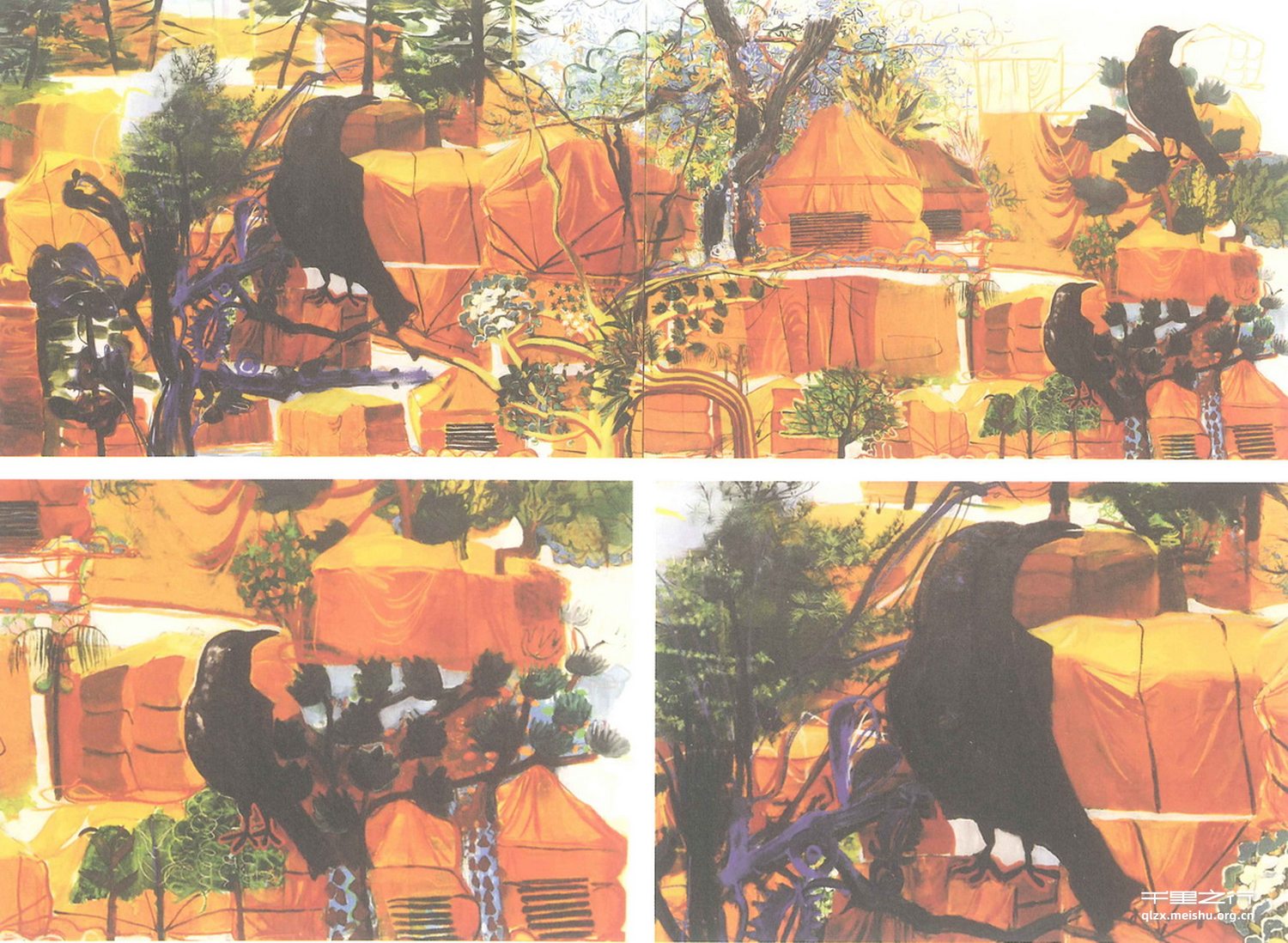 在日本坐电车时,我看到了橘黄色的帐篷和好多茂盛的树木,树木和帐篷不经意的结合,让我感到很有趣。当时被那阳光照耀下的橘黄色和奇形怪状的树木所吸引。坐在电车里,电车移动过程中每个窗户里的帐篷和树木像电影里的分镜头。帐篷和树木在每个窗户里的影像让我有了创作的灵感,所以我就想表达把每个帐篷,以不同的视角呈现在一个画面里。