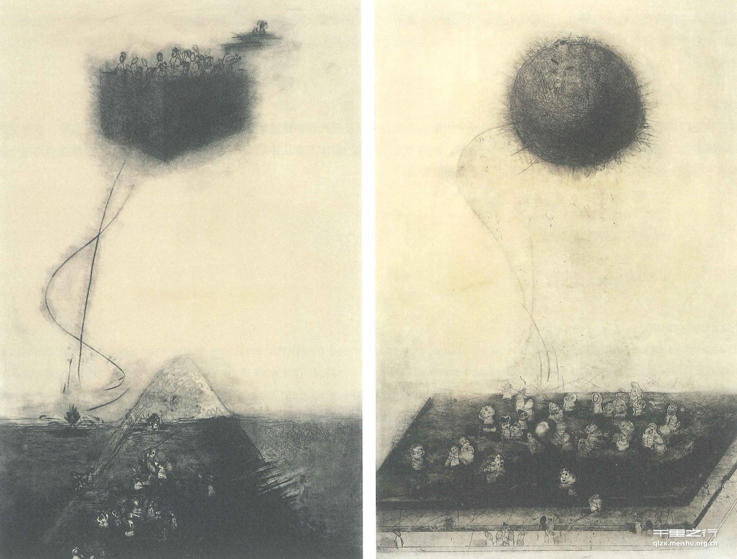 我的毕业创作是采用铜版来表现的。我的作品主题想表现的是家的感受,离家的、在家的、归家的和渴望家的感觉,所以我选用了鸟巢这一素材。“巢”,也就是“家”的体现,但是单纯的鸟巢缺少一些趣味性,所以我把几何形体与之相结合而组成了几何形状的鸟巢,中间并穿插着一些简略而大量的小人物组成画面,以体现我想表达的人“在家,离家,归家和渴望家”的感受。