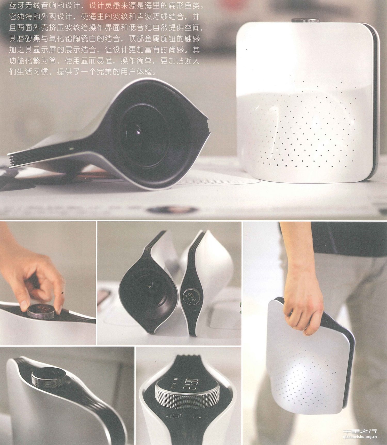 蓝牙无线音响的设计,设计灵感来源是海里的扁形鱼类。它独特的外观设计,使海里的波纹和声波巧妙结合,并且两面外壳挤压波纹给操作界面和低音炮自然提供空间,其磨砂黑与氧化铝陶瓷白的结合,顶部金属旋钮的触感加之其显示屏的展示结合,让设计更加富有时尚感。其功能化繁为简,使用显而易懂,操作简单,更加贴近人们生活习惯,提供了一个完美的用户体验。