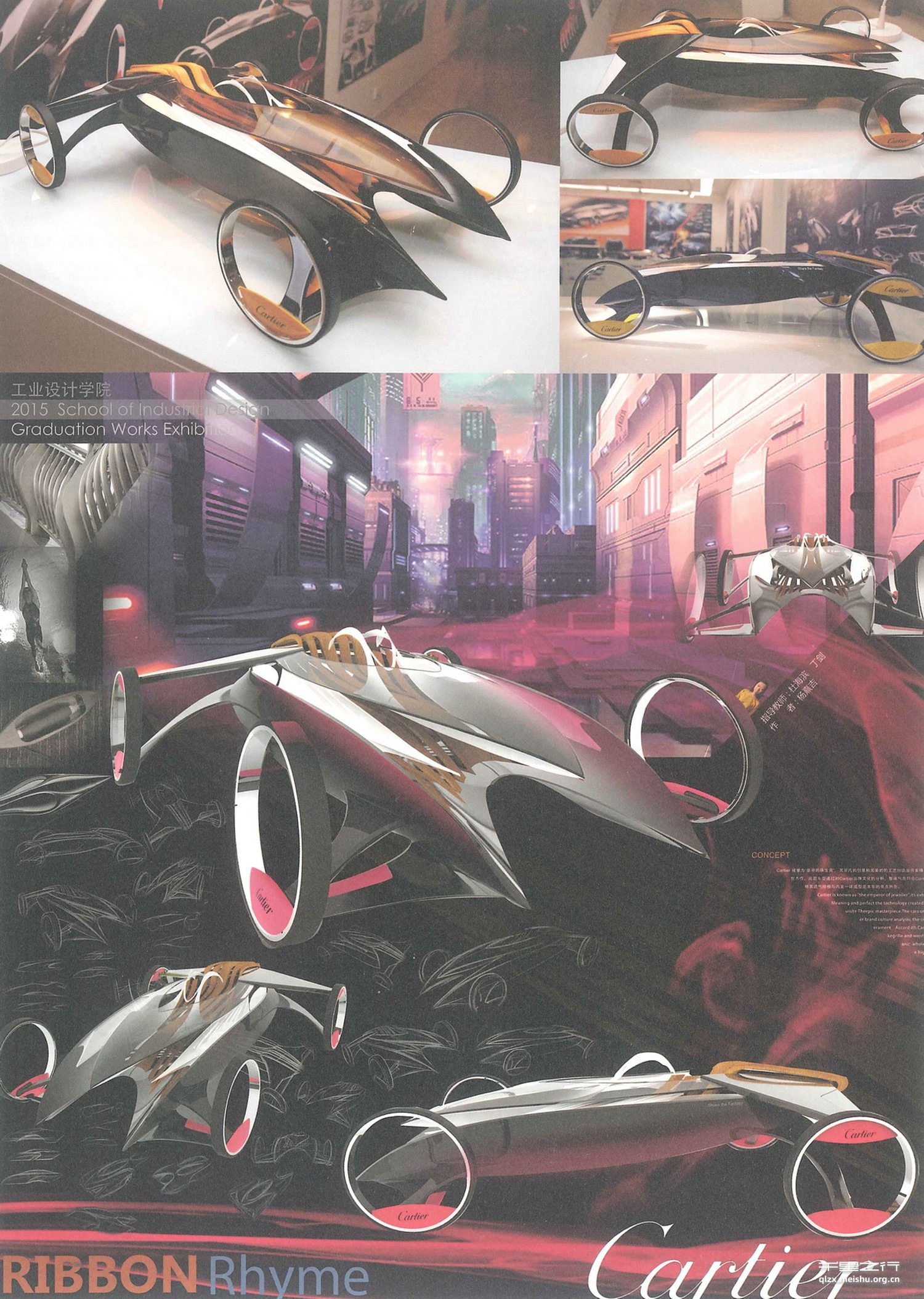 杨熹吉的作品《RIBBONRhyme》概念车通过对 Cartier品牌的研究分析和清晰的定位,很好地将 Cartier的高贵气质移植到了这款为女性而设计的概念车上。其造型轻巧而犀利、简洁而轻松,具有较高的识别性和品质感,尤其在内饰的一体化设计上体现了作者较高的思考能力和美学修养。