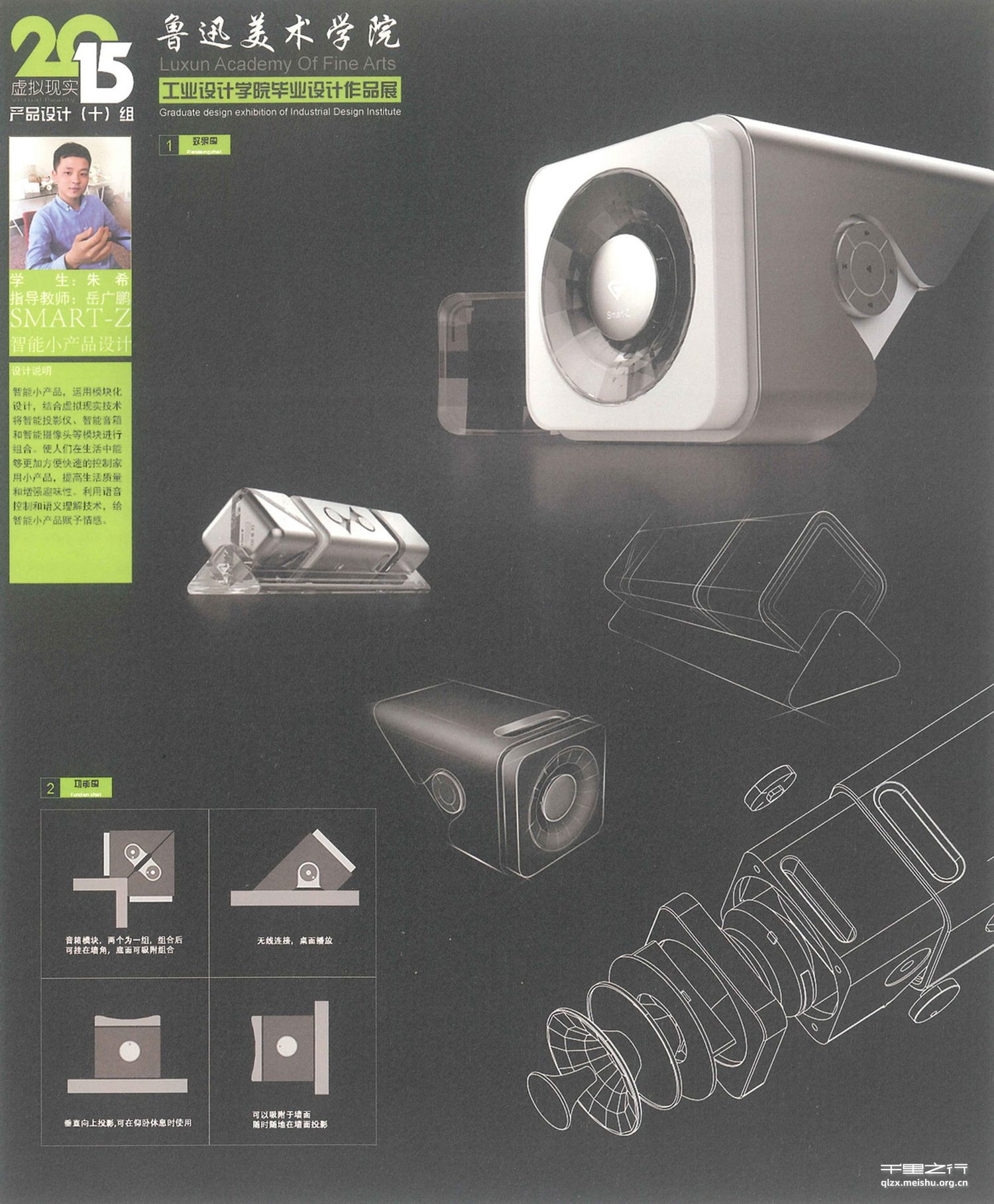 智能小产品设计运用模块化设计,结合虚拟现实技术将智能投影仪、智能音箱和智能摄像头等模块进行组合。使人们在生活中能够更加方便快速的控制家用小产品,提高生活质量和增强趣味性。使用语音控制和语义理解,给智能小产品赋予情感。它主要以几何化造型为主导造型语言,结合模块化的设计思想,用极具科技感的设计元素来体现智能产品的主题。