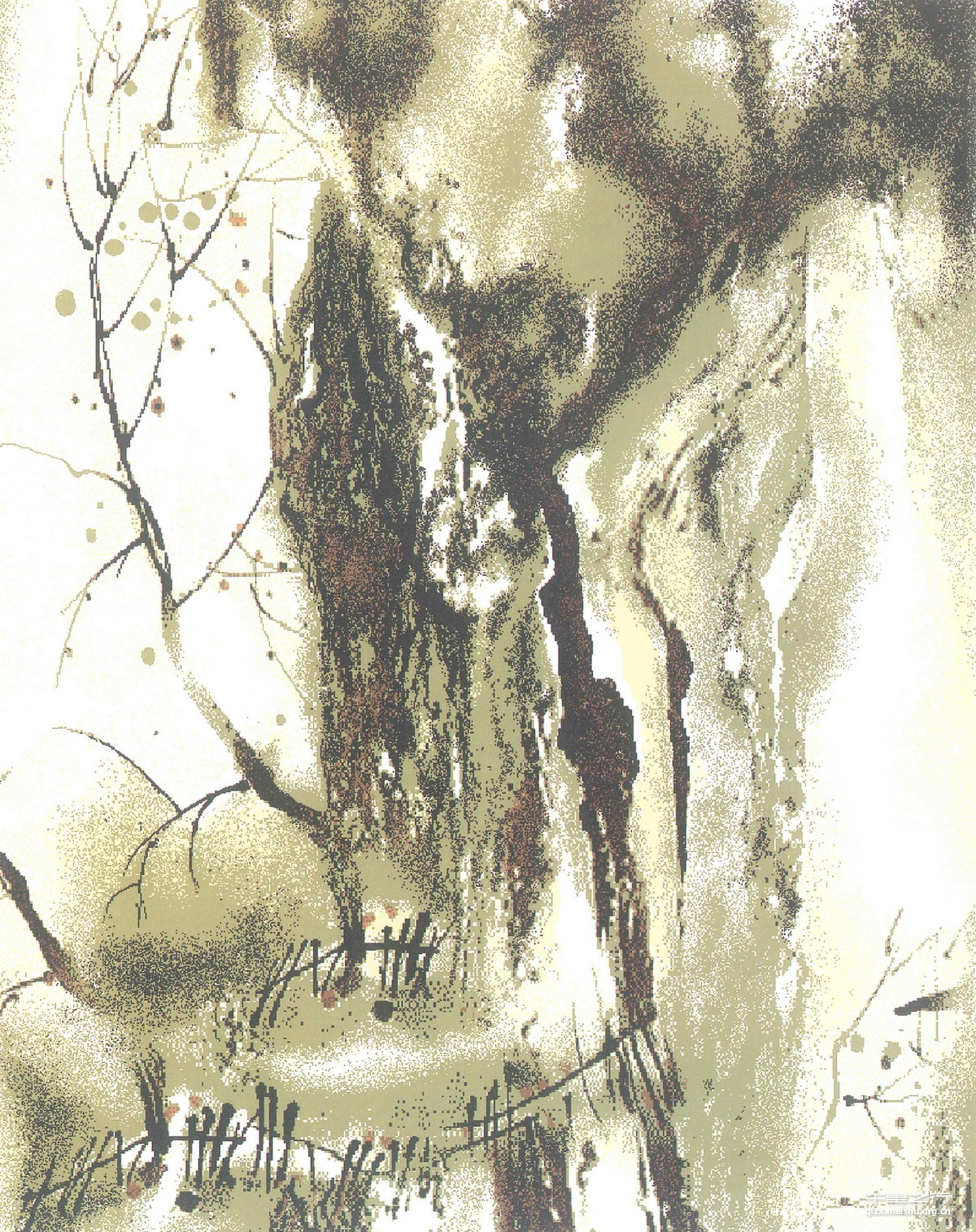 本作品灵感来源于自然,借以抽象的手法表现出自然界中自然洒脱的意境。古木幽篱在绿色的点染中氤氲成一幅浓墨淡彩的水墨山画。古老的枝杈随风曳,树影婆娑,风拂树动,营造出了一种恬淡自然的意境。在色彩的运用上,以绿色为主调,穿插着随意而富于韵律的黑色线条,勾勒出流畅自然之美。而点缀其中的红色圆点,则打破了沉寂,让整个作品更富生命的韵律。