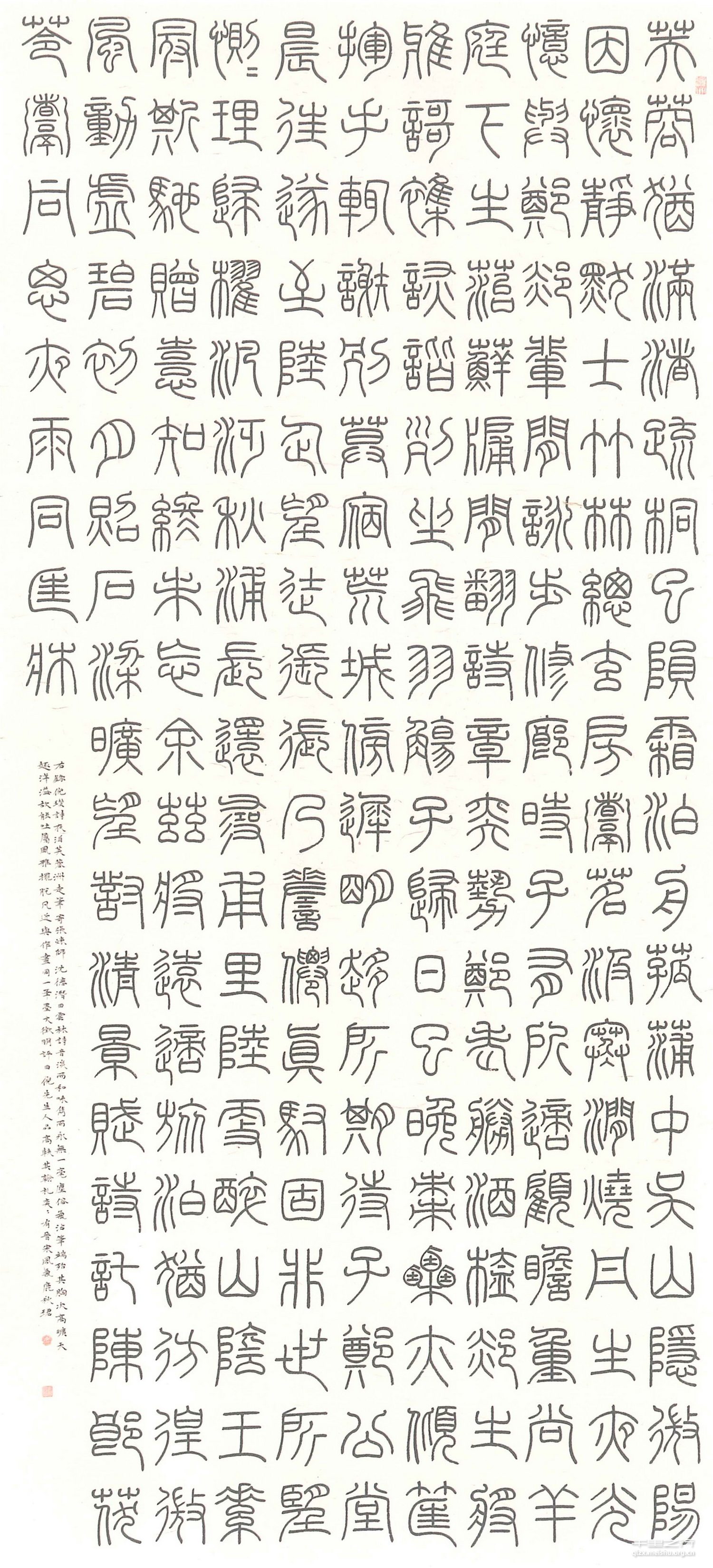 鹿秋珺内秀而沉静好学,所书小篆《倪瓒诗》避秦人而师汉代《袁安碑》,洋洋二百余字,从容不苟,成堂皇大作,有碑版正大之象;且气息平淡,笔态渊雅,味隽而永,与倪云林之诗互为表里,作隐逸高旷之风。属款小字,复作云林之体,娟秀古媚,契然相合。整体观之,虽情性内敛,平实有余,然静中能大,清而能正,不拘不怪,不为尘扰,有格局而兼格调,殊为书道正途,所望其行必远也。