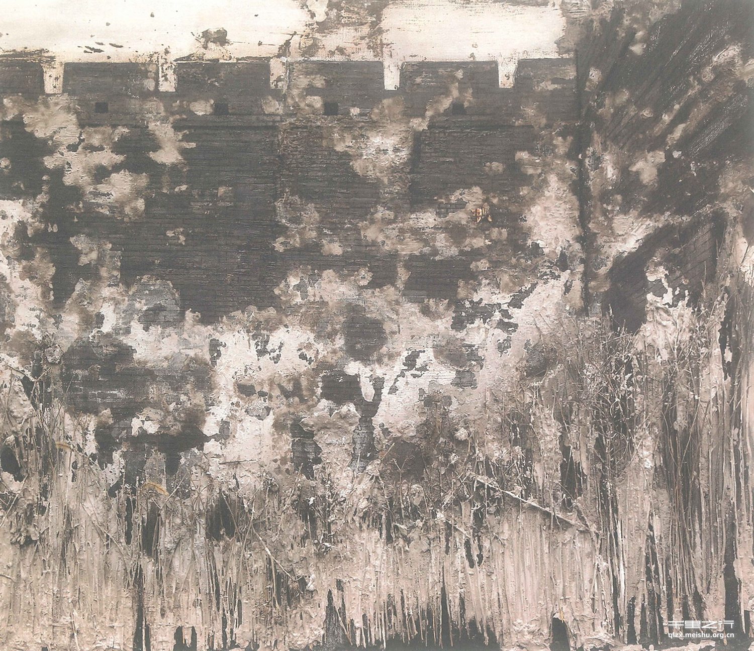 尝试在绘画语言上结合多种材料,形成一种新的语义力场。水泥将树枝和颜料绘制的画面覆盖,然后让水泥一定程度地剥落,收集碎片。这一过程基于我对绘画不断反复过程的探讨,材料的使用始于破坏画面,但目的是构建画面的更多维度。选取城墙作为画面载体,源于城墙厚重沧桑的质感,也因为城墙墙体和作品实施方式的契合。
