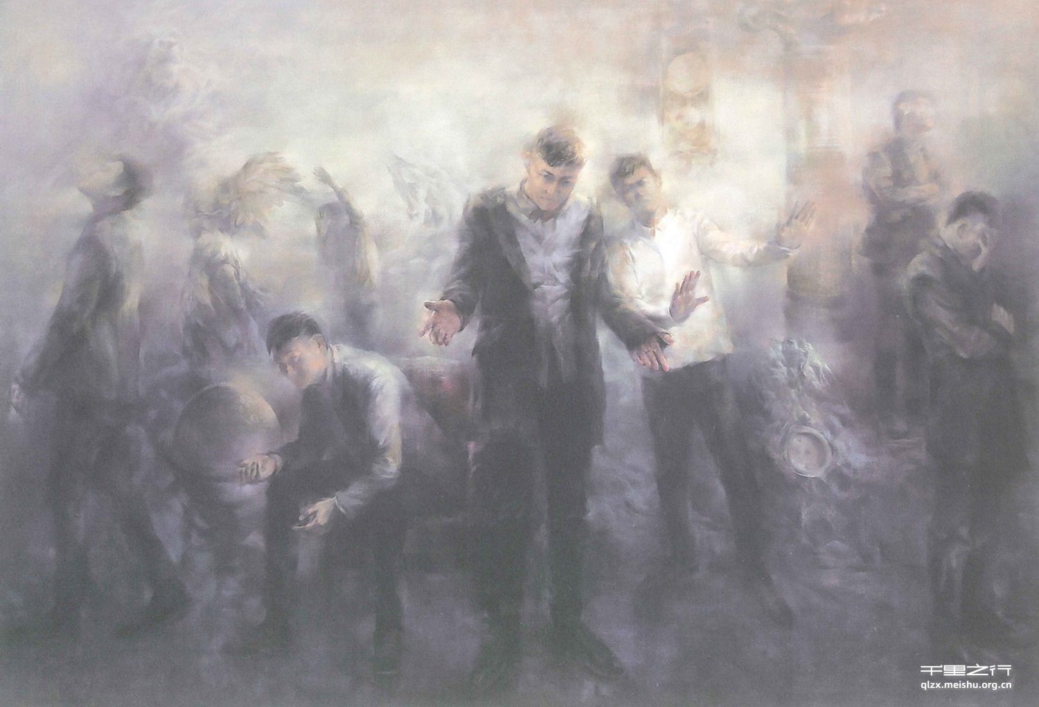 人在各种价值观念形成的过程中,会呈现不同面貌的自己,像在青年时期的我们,从充满幻想到现实的过渡中会出现无奈、沉默、自怨自艾等等的精神状态。我渴望去切实表达自身感受,试图让观众产生共鸣。在这幅画的创作过程中,表达的欲望始终是间断的,有限的,它像是与人对话时的犹豫和思考。