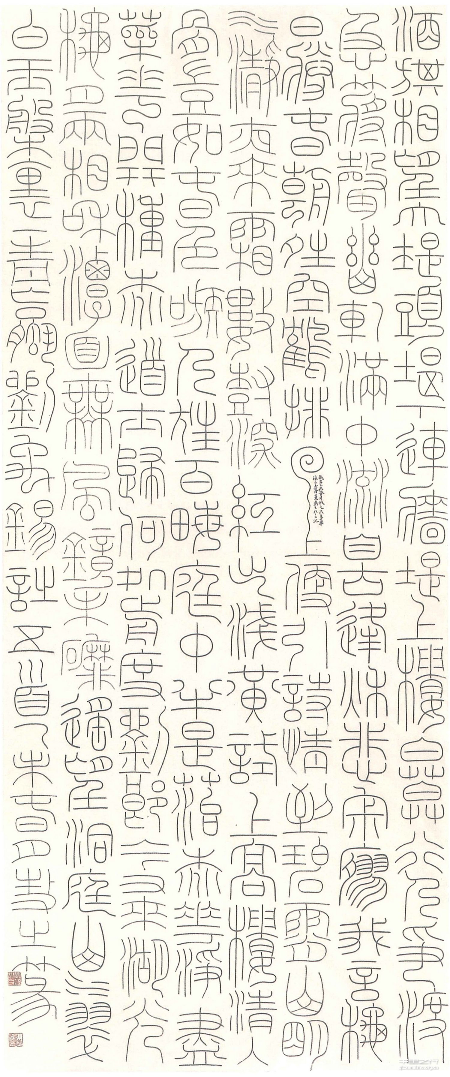 玉箸篆是一种工稳到极致的篆书,通常以匀称秀丽、婉转挺拔取胜,因其过于工稳,书写技术难度大,写出趣味尤为可贵。偶读元朱文印谱,突然萌生出一种想法,尝试在一张工稳至极的篆书作品中加入韩登安、陈巨来先生的细朱文印章元素,强化字与字之间的联系,将字法印化,使得作品的整体感得以加强,经过多次尝试,和谐可观。