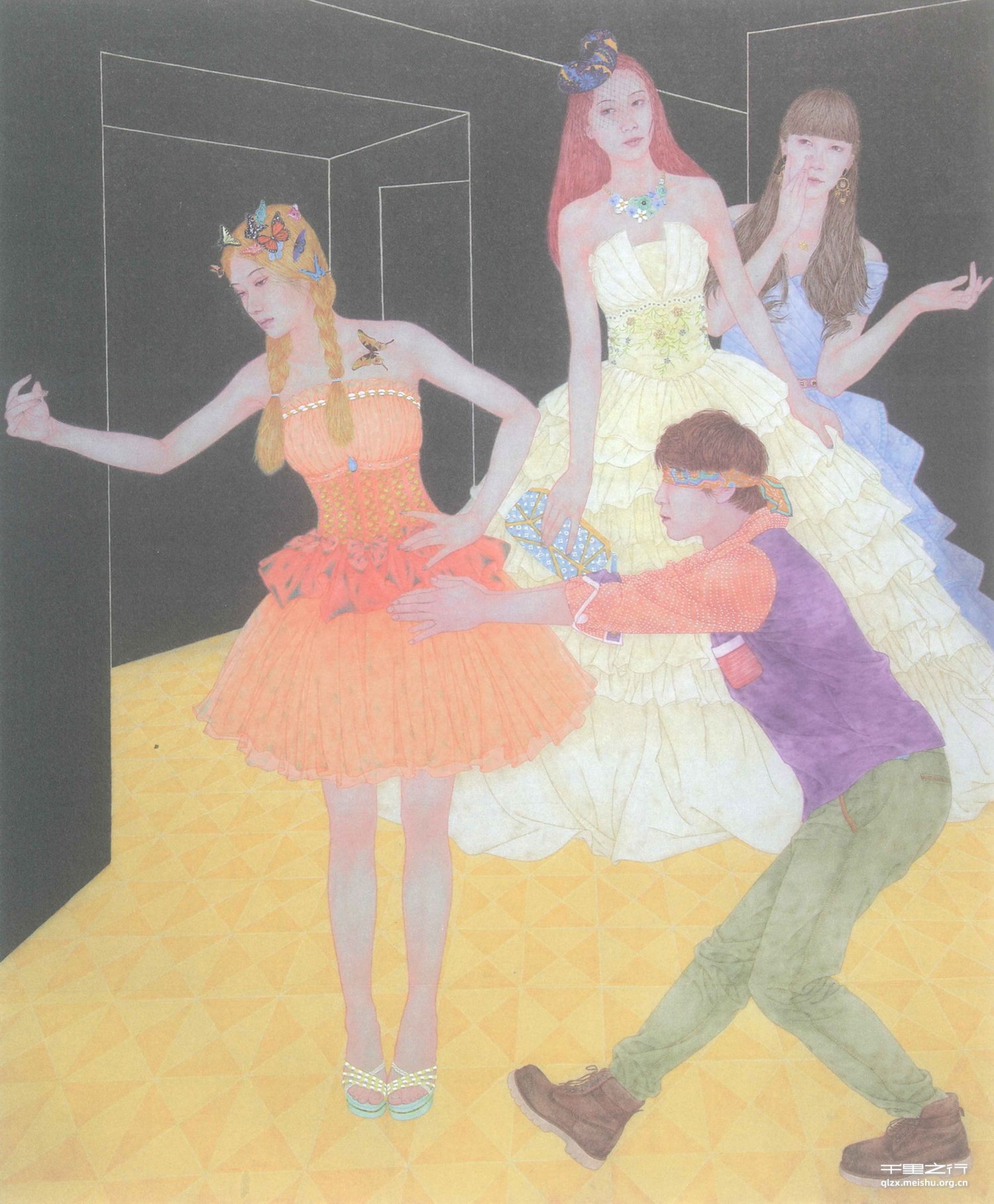 春风吹拂开来,将空中的繁星吹落,各式各样的醉人香气弥漫着,悦耳的音乐之声四处回荡。美人的头上都戴着靓丽的饰物,晶莹多彩的装扮在人群中晃动,他们面带微笑,带着淡淡的香气经过。我寻找那人千百次都未找到她。此画我应用鲜艳的色彩、强烈对比表现了男子对爱情的渴望,加上金银饰品的点缀增加了画面的都市气息。这正表现了当下许多单生男们的处境。