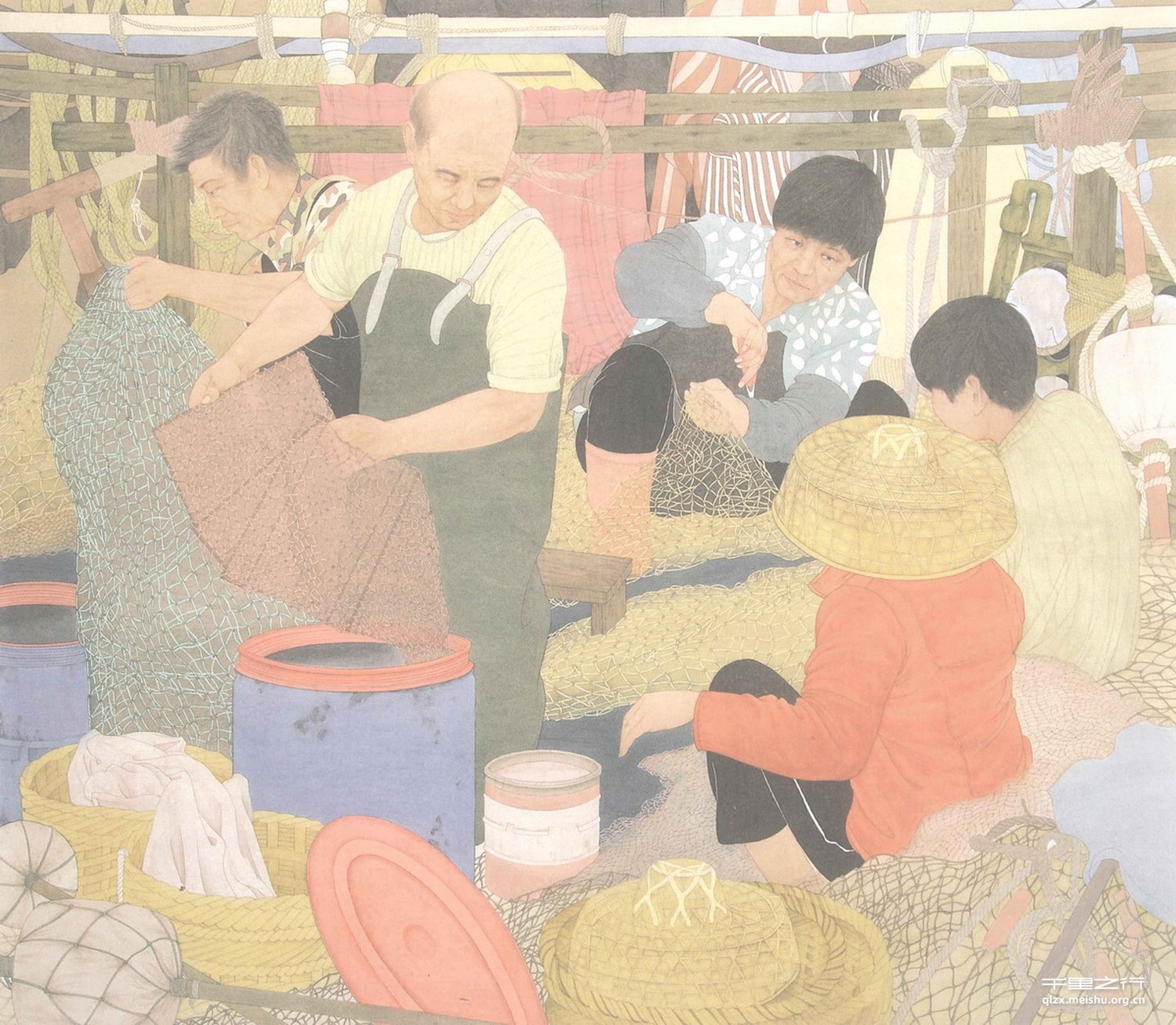 本幅画面简单地记录了海口海甸河畔的场景。三四点的下午,忙完一天劳作的渔民们除了在向岸边行人兜售当天的海产品外,还有三五成群的人影在甲板上织补着渔网,渔网是他们的依靠,是生活的希望。他们唠嗑着生活的碎语,织补着憧憬的明天。我只想用单纯的画笔留住平凡生活的一瞥。