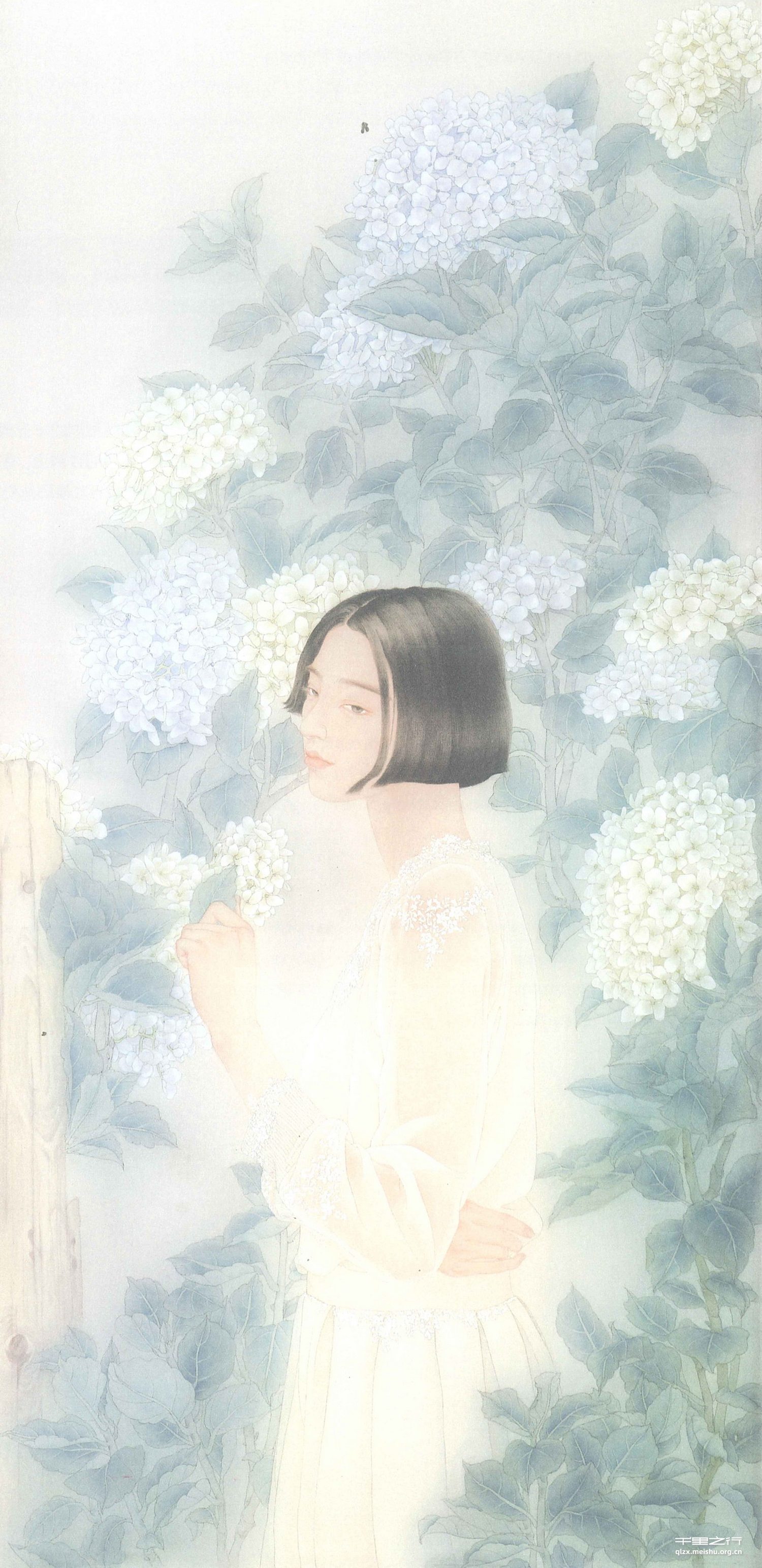 毕业创作绢本设色中国画作品《谧·回眸》。作品描绘的是一个身着白纱衣的少女站在雾雨朦胧绣球花从中回眸的一瞬间。作品旨在用现代侍女和绣球花来表现现代喧嚣都市中这打动我的回眸的一瞬间世界停驻,静谧,沉静,鲜活,细腻的感触。通过绣球花丛来和纱衣少女的细节制造静谧纯净自由的氛围。表现宁静自然,积极幸福的情感。