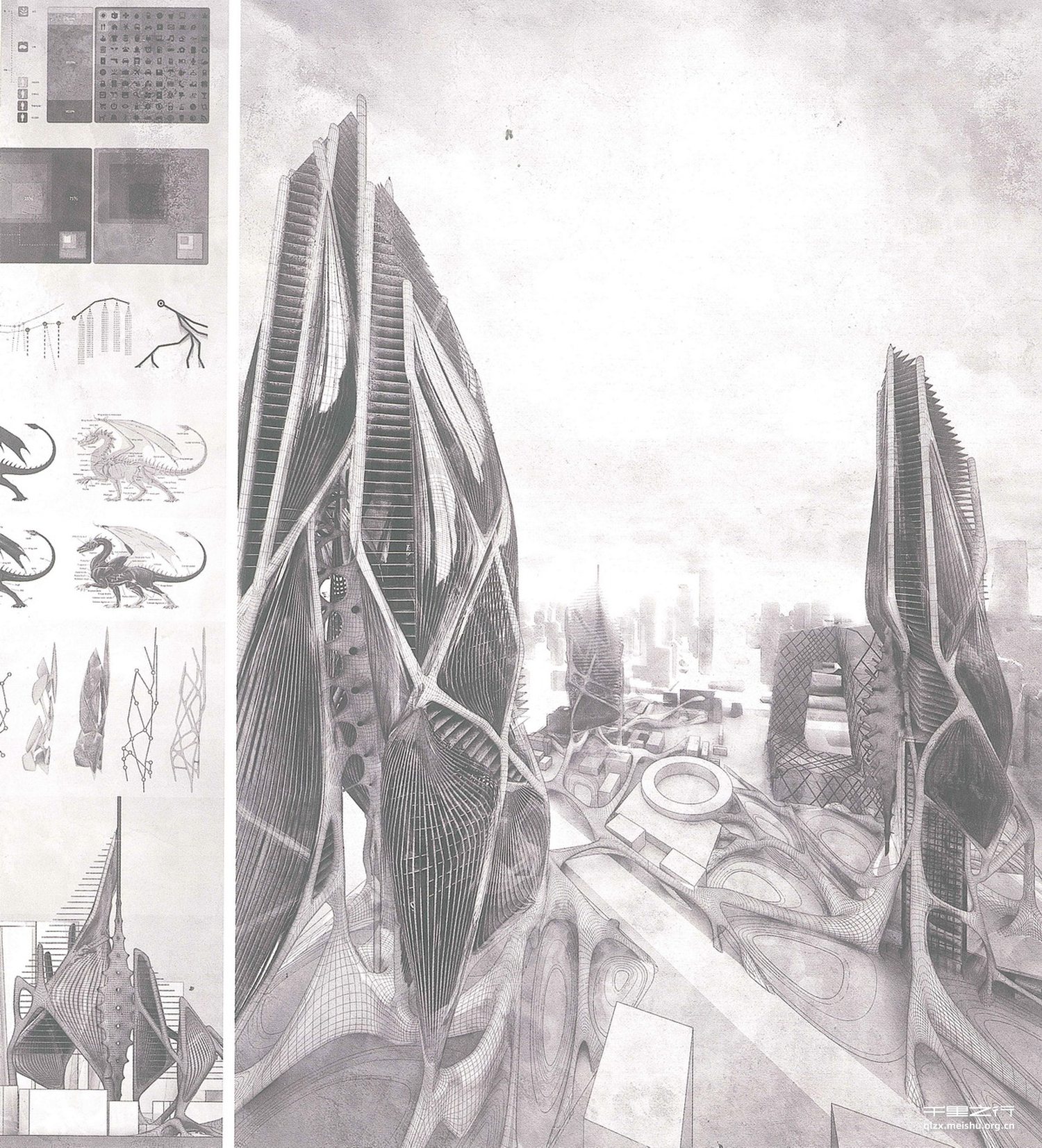 “熵”是物理学上用来形容一个体系混乱程度的单位。如果“熵” 达到极致就会使旧的体系崩溃从而建立新的体系。现代社会与城 市正处于这样一种极端复杂状态的边缘。因此,作者希望通过《熵 城》对未来的有机建筑做一种假想。