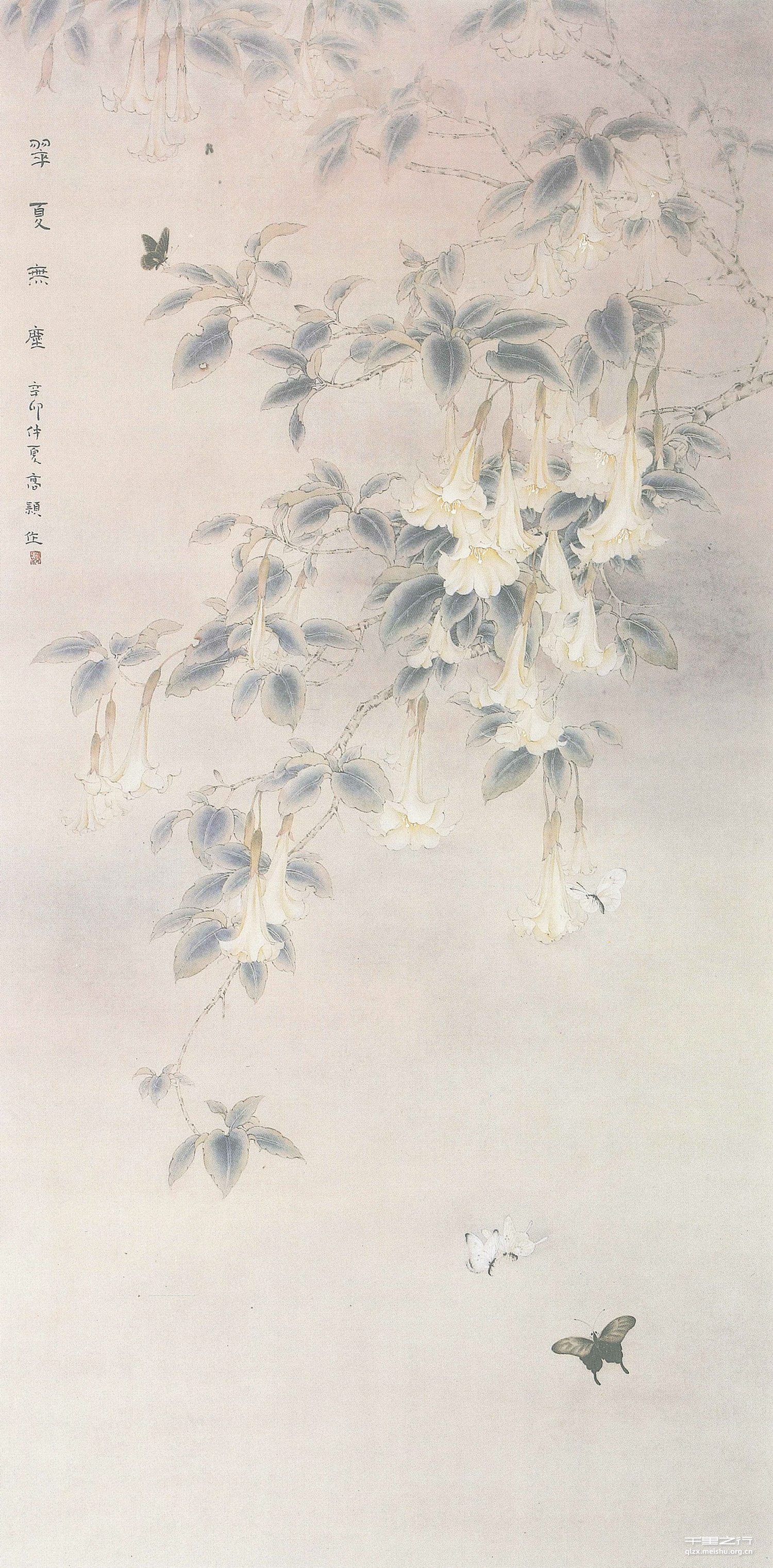 我的作品在传统构图的基础上增加了现代的形式感,利用并且夸大曼陀罗花的生长特性,选择了一种垂坠的形式。画面下端故意拉长空间就是为了烘托这种夸张的垂坠感,再用蝴蝶加以补充,使之更加完整且富有情趣。此作品处理成浅紫色背景,一是个人比较喜欢,二是紫色代表着一种安静、高雅、高洁,也正是本作品《翠夏无尘》所要表达的境界。