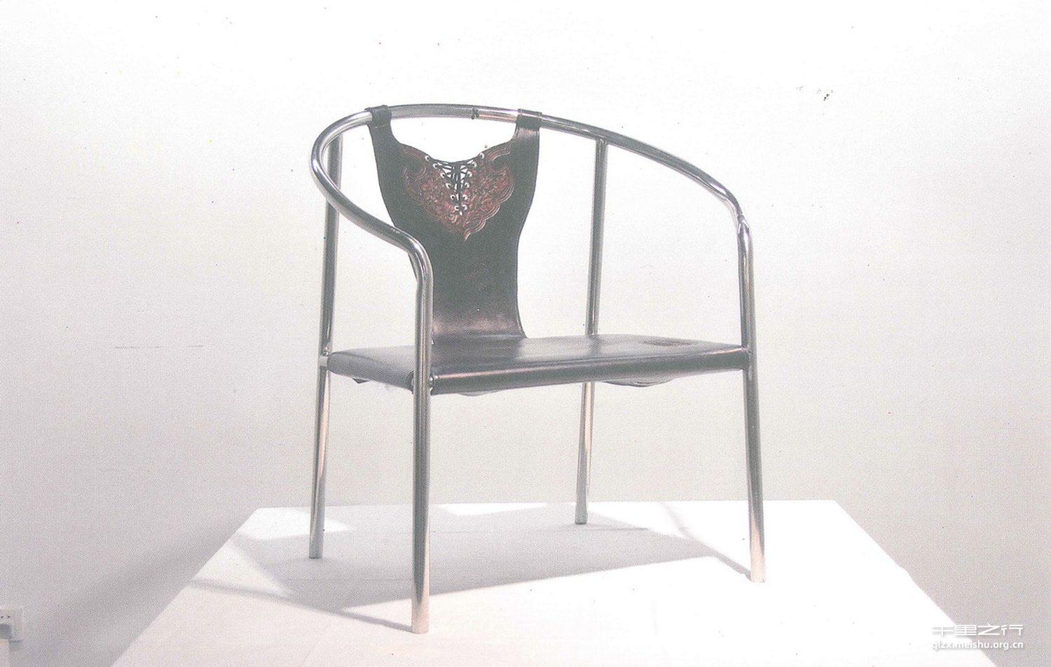 本款设计方案重新解构明式圈椅,将结构最简化。突出了元素符号“圈”,用不锈钢金属取代了木质结构。简约现代,融合女性服装元素。大气中不失性感,结合皮雕工艺,简约中不失细节魅力。拥有高贵的气质,从传统中走来,重新诠释了中国独特的东方魅力。