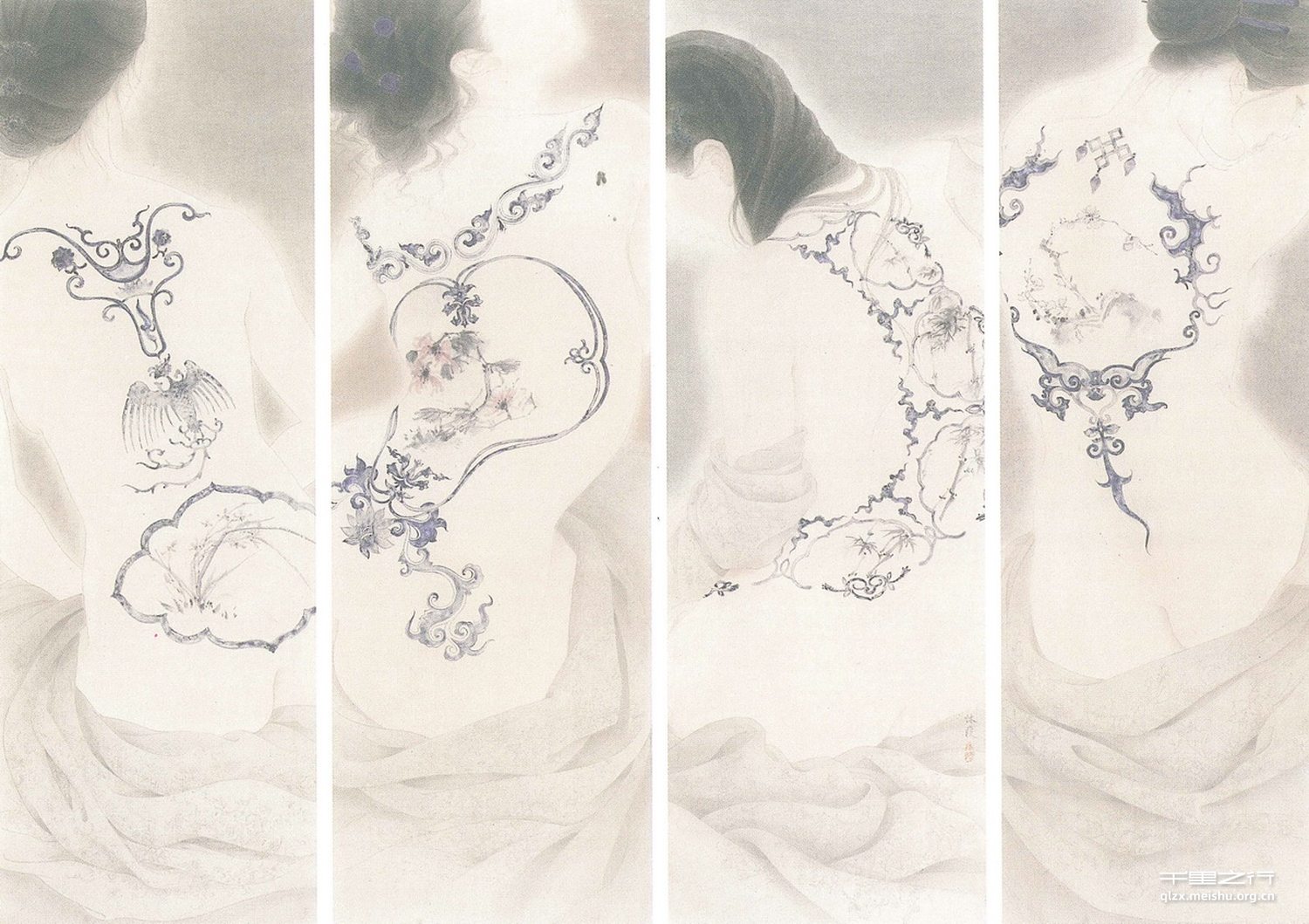 结合工笔与写意手法,将梅兰竹菊、青花瓷与女人体融合在一起,营造一种唯美淡雅的意境。