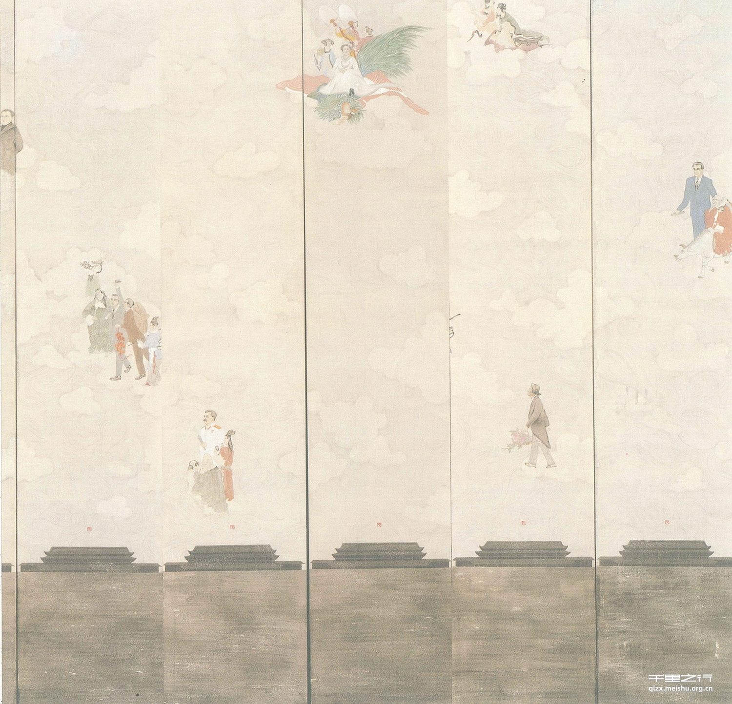 画中的奥巴马、希拉里、梅德韦杰夫、萨科齐、英国女皇、斯大林、小泉纯一郎和金曰成都是演主角的“神仙”。他们手中有中国古代上朝时的“笏板”,也有蟠桃、石榴、河蟹(和谐)等寓意美好的“礼物”。故宫之上,群贤荟萃,少长咸集。新群仙祝寿,即是万国来朝。在风云变幻莫测的当今,中华民族已复兴崛起,屹立于世界民族之林。