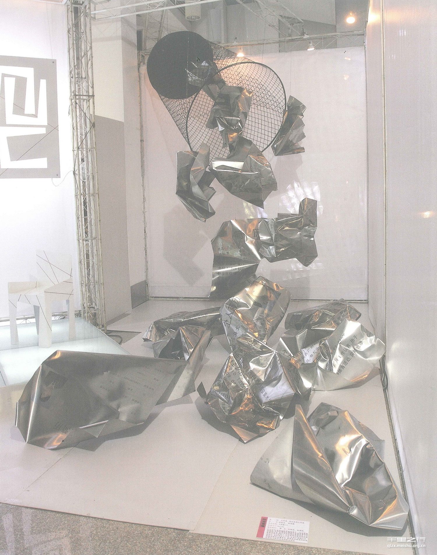 在材质上选用金属材料,改变了垃圾筐原有的材质效果,同时通过放大的金属材料坚硬冰冷的质感与所表达的残酷就业现实状况相唿应。