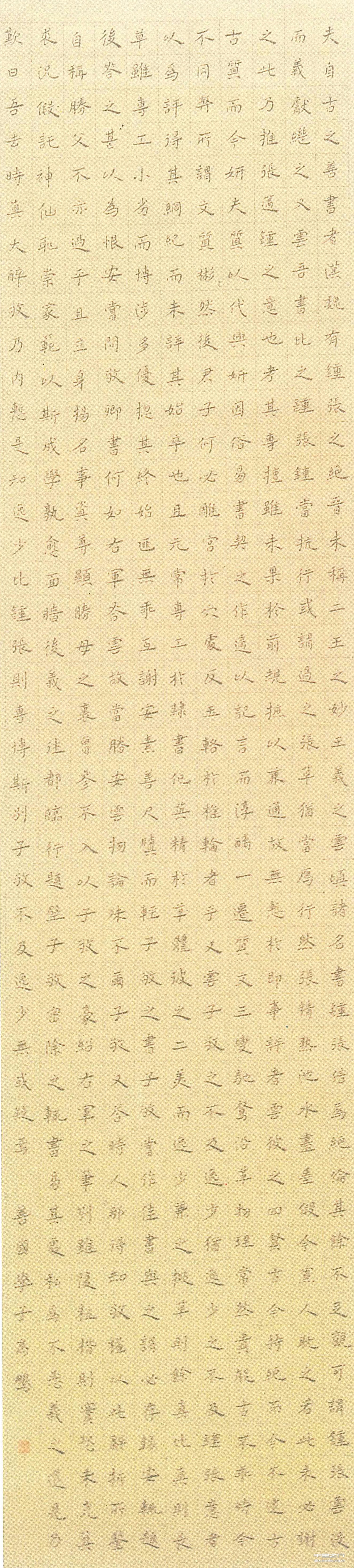 吾习端楷已近七余年,初以颜鲁公入手,后学褚登善,自丁亥年(2007)考入鲁美后,之于楷书,多醉心于魏晋小楷兼习北朝石刻。此作系辛卯年(2011)毕业展览之作,古人多讲“书如作字”,这要求我们在书法创作时对线条、空间极为敏感,然这不免多有做作之嫌,可“草贵沉实,楷贵灵动”确又道出楷书之奥妙,故吾书写此作时,力求把这二者统一,在精心布置的同时,亦多注重其书写性。至于取法何处,譬如习武者临敌,哪容得你一招一式现想去对策。此作凡五百余字,一气呵成,吾平曰之学力求注于笔端,呈于纸墨,变化之中,和谐统一,与古贤“书肇于自然,流于天成”相合。此吾之所求也。