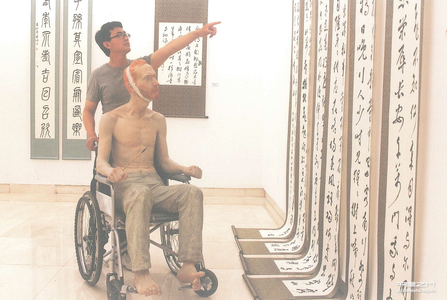 此件作品以雕塑、录像.、行为艺术相交叉的形式来表达我的思想,以此种形式来探索写实雕塑在当代艺术中新的发展,进入当代写实语境。在作品中我加入中国元素,请梵高大师看国画,学书法。我想表达人文关怀,我们来关怀大师,大师来关注中国艺术。在全球化时代背景下,让我们同大师共同走进美术馆。