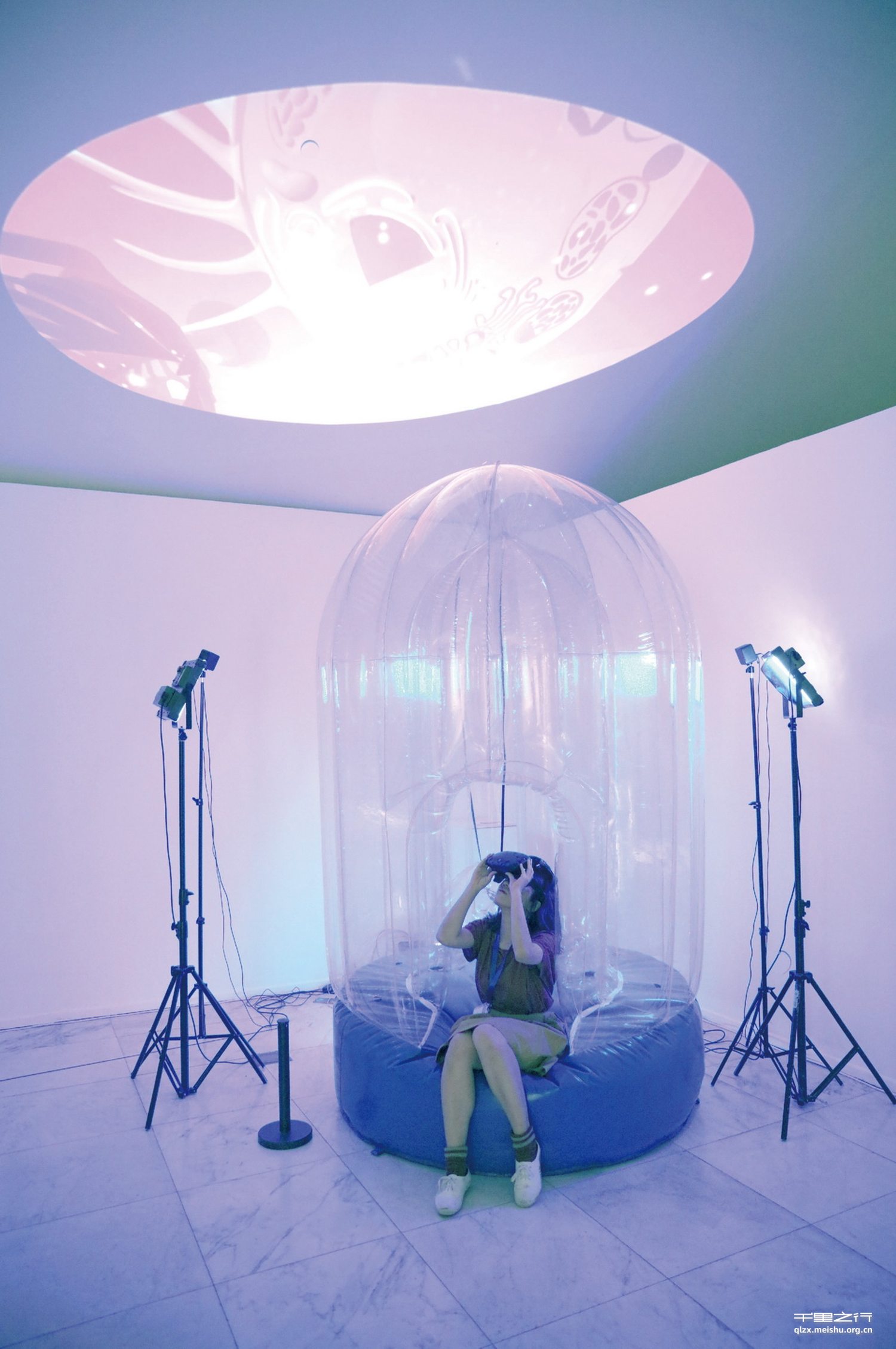 许多VR作品都挺傻的,艺术家拿出吃奶的劲仿造一个虚幻世界,头戴毫无任何人性化设计的眼镜,观者的身体直立着,与地平线构成一个十字架,沉重地拴住眼前的虚拟世界内味同嚼蜡的3D图形,就像是做梦时胸部压着一块石头。吴碧琳让观众放平身体,因此,人不再用身体的尺度和“大地”纬度来丈量另外一个世界。瞬间,人变得无能为力,连拥有欲望的权利也被放弃,将自己融化于颅内的动物园,与作品中超感性的视觉语言和女性般的柔软材料浑然为一体。