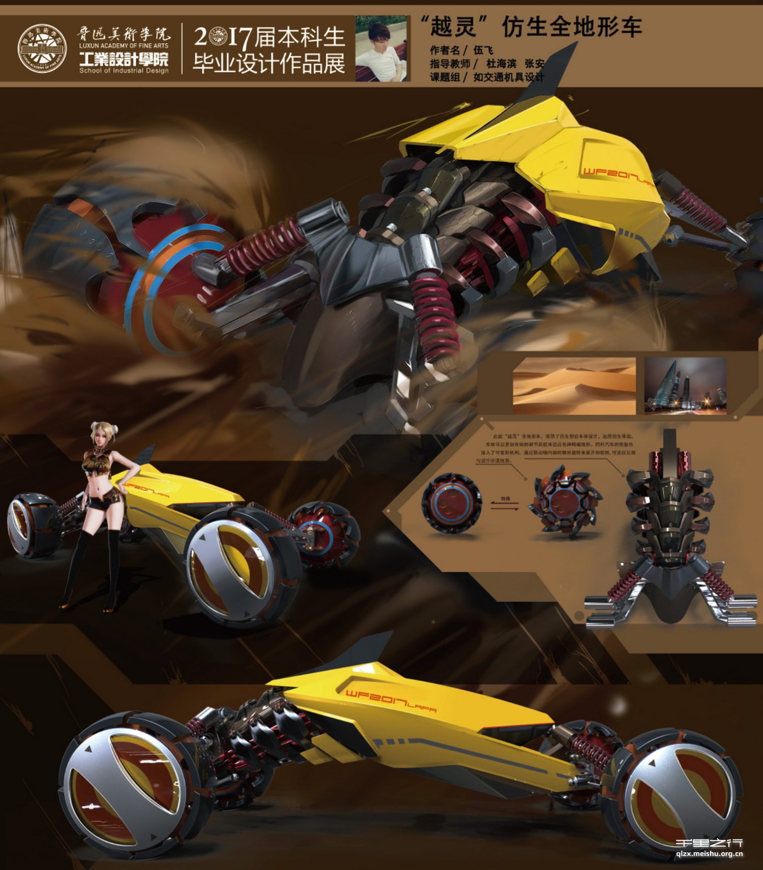 作品体现出高强度的概念推敲过程,诠释了一个合理有依据的概念设计故事。创新的造型设计,独特的悬架结构,使仿生的“中枢力星"与机械结构间无缝融合。极具视觉冲击力的作品。