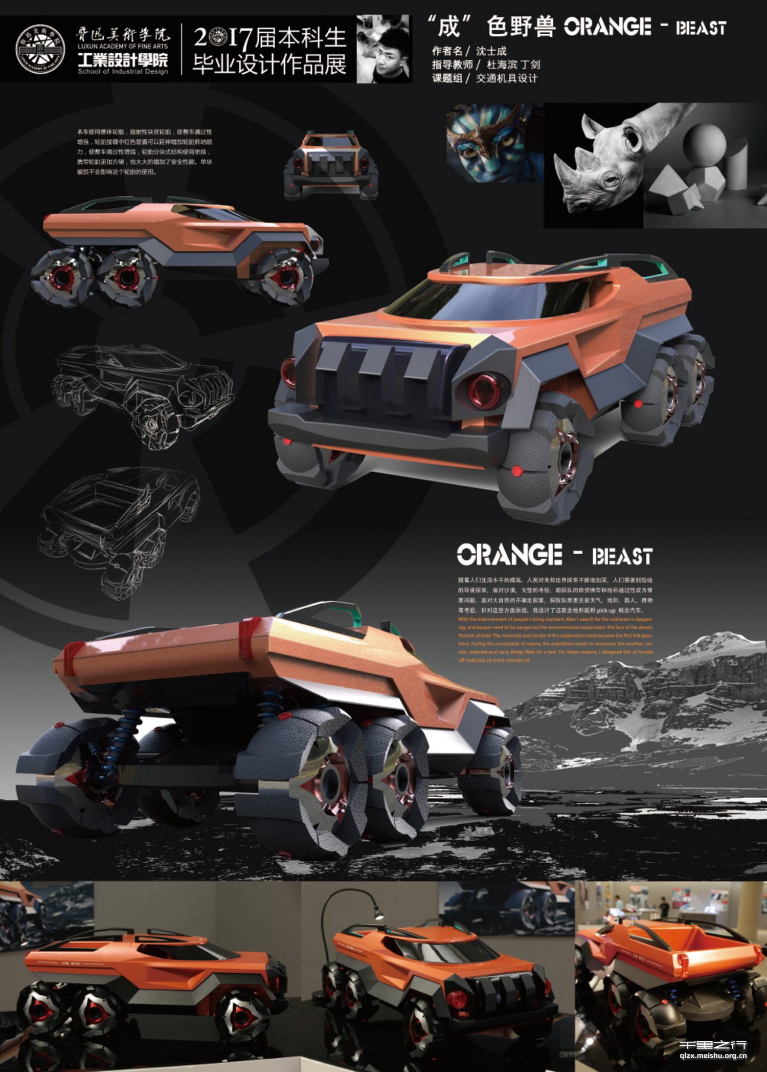 “成”色野兽是一辆越野皮卡,设计名字中的“成”有三个含义,第一取自作者名字中的“成”,第二谐音车身上的橙色,第三寓意着每次科硏人员或救生人员越野勘探的成功。本设计主要适用于野外勘探、沙漠救援等任务。在功能性上,此皮卡轮眙采用分体式设计,