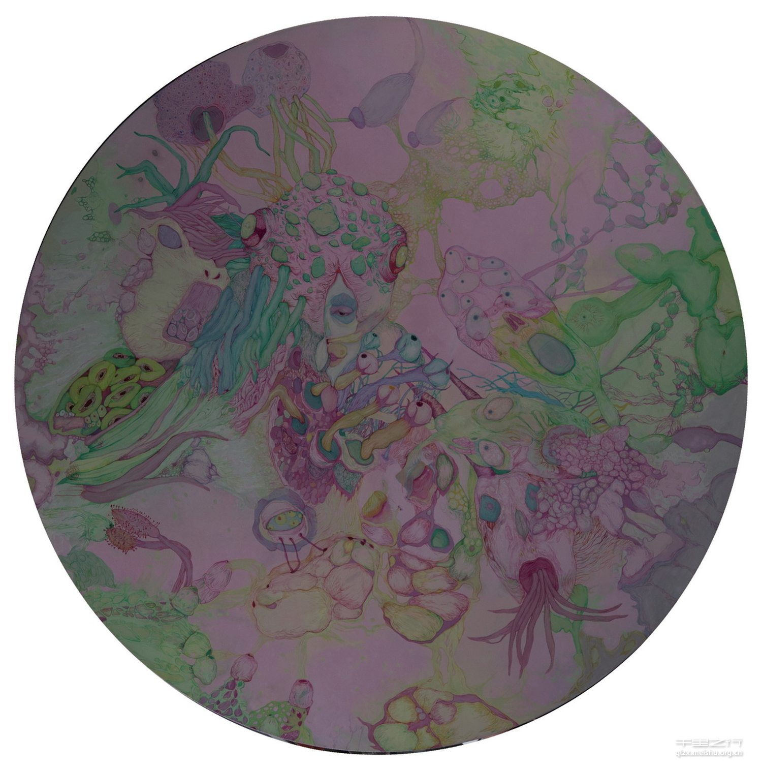 祝程近期的作品是以各种类型的生物形态作为她的描述主题,其中包含着一种多元性和复杂性,并运用了独特的个人审美角度去体验它。在共同生存或相互排斥的关系上,这又是一种迷茫、焦虑的欲望交错。透过她的作品我们可以理解,在虚拟世界中关系的依赖性和重要性,通过痛快淋漓的宣泄和用于描绘混沌情景的视觉图像,表达了她对当下社会和人的虚拟的一种新的尝试和态度。