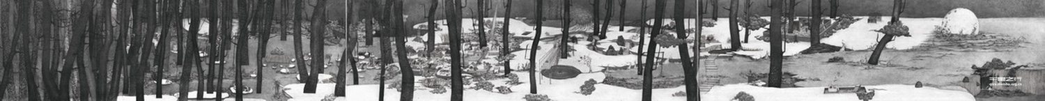 一个渐渐被树林隐蔽的静谧之境,呈现了作者想象中的世外般的理想境界,然而理想世界与现实生活所产生的落差,也反映了作者对之产生既向往又否定的复杂矛盾心理。该作品的画面以独特的长卷形式呈现,观者在走动赏画的过程中,心里亦将随着逐渐隐秘的小世界而产生心理变化,从而有不同的观感和体会。