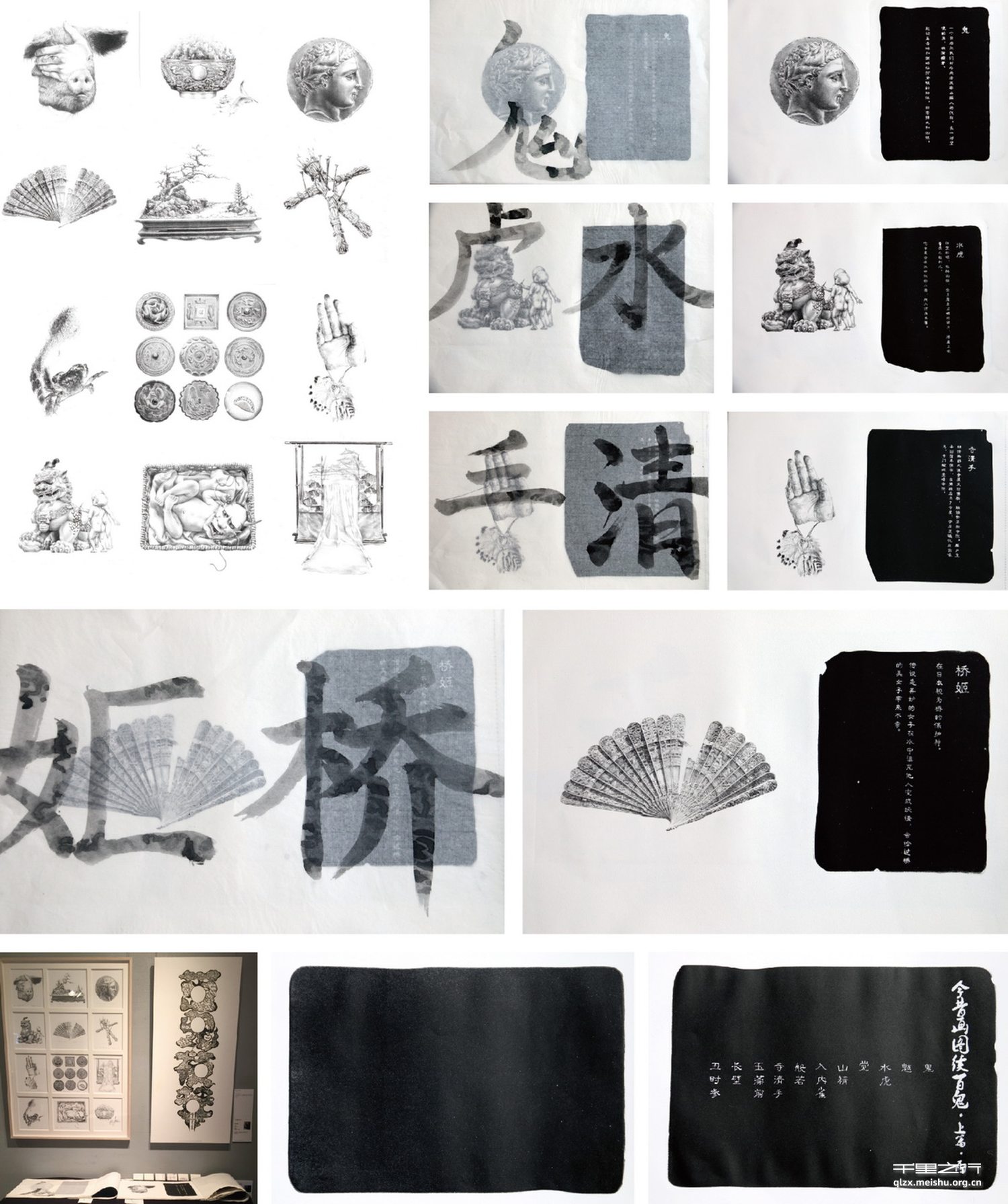 每一页妖怪内容包括文字说明都是用石版绘制,石版画是一种令画面有更多细节、更有重量的媒介,让每一页都是独一无二的艺术品,独一无二的故事。重新制作日本妖怪绘师鸟山石燕的《百鬼夜行》,妖怪本身的故事不变,但与鸟山石燕的浮世绘不同,用石版画并用砂目技法绘制,换了一个版种,换了一种画法,换了一种表达来表现同一个故事。通过联系原作中的妖怪与现实中的物品,用动物、古物等元素间接隐晦地再现了妖怪的故事,而这种暗示的内容用石版画细腻写实地呈现出来,让内容上和画面上多了一层意味和对比。独一无二的石版砂目技法绘制的画与石版油底技法印制的文字结合阅读。最后在每一个观众的脑海里呈现了独一无二的妖怪形象联想。