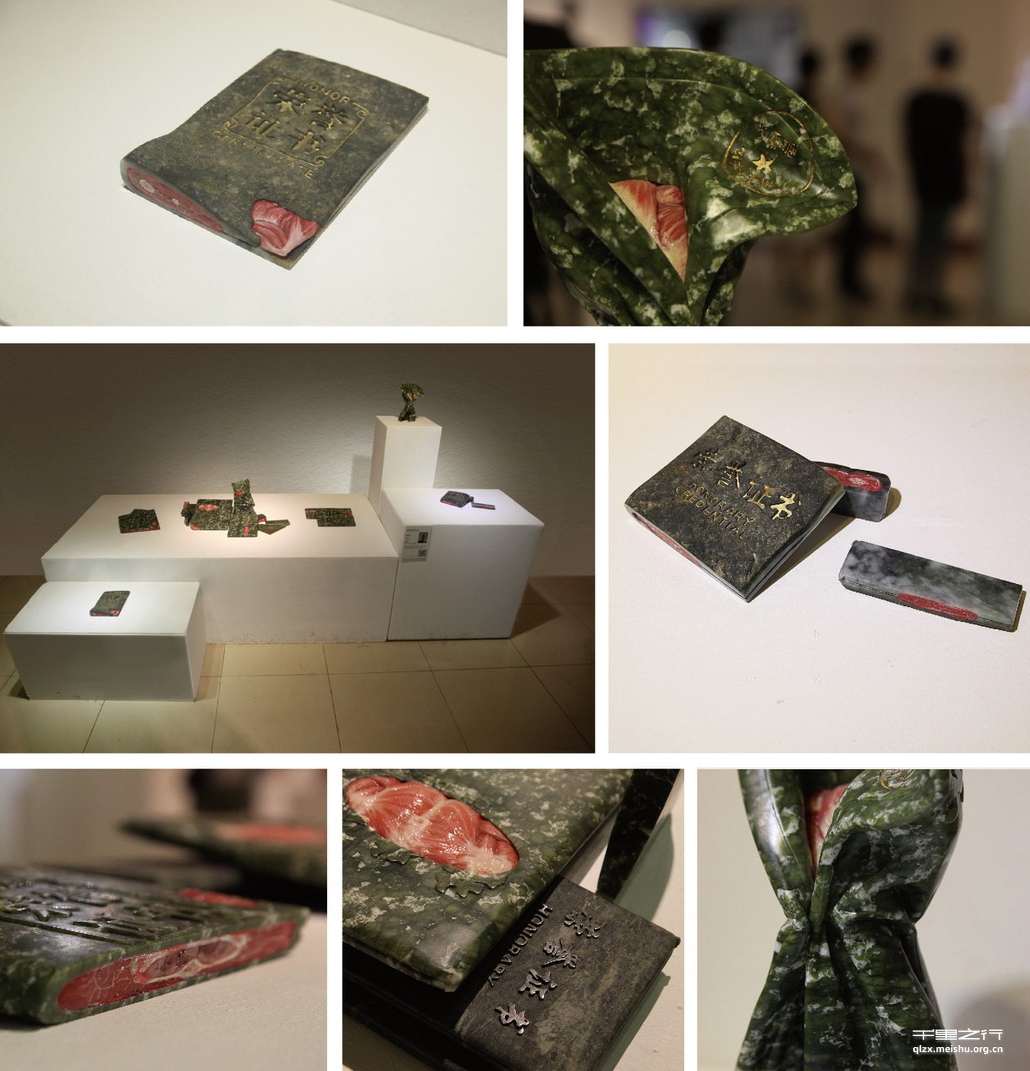 用玉石雕琢而成的“荣誉证书”对于大多数人来说,可能都是新鲜事物。这件作品就是一系列用玉石雕琢而成的荣誉证书。玉作为一种寄托华夏民族情感与精神的材料,本身便具有一种高贵的气质,经过物质世界的包装,往往又使其产生了高昂的经济价值。用玉雕刻的荣誉证书更加凸显了“荣誉”的珍贵。然而玉这种材料使用在荣誉证书之上,似乎又显得有些“过分”,但在当代艺术的语境中,这种“过分”又可以解读成一种“调侃”。加之作者还利用了非常写实的雕塑手法,在这些玉雕的荣誉证书中塑造了一些裸露的“红肉”,让人无法回避地去思考荣誉的背后那些付出。