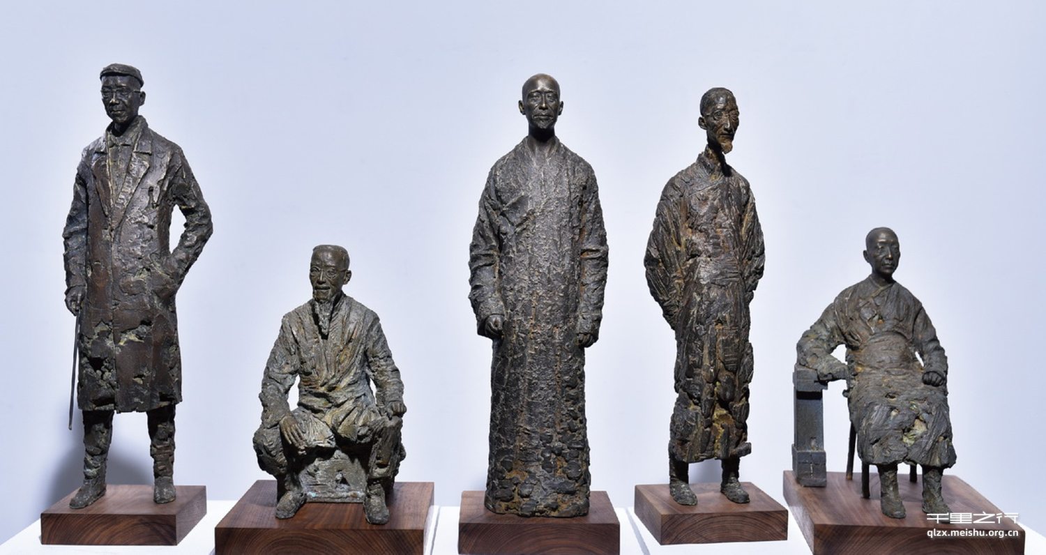 这一组人物是清末民初时期西泠印社第一批社员,他们大多数是国画书法大家,在我国西方文化与中国传统文化大交融的时期。我把人物的头与手以具象手法塑造,衣纹的处理是取他们各自书法绘画的笔法表现。人物的身高比例依据个人的人物性格、形象气质去构建。这是传统具象雕塑与中国文化再次结合。