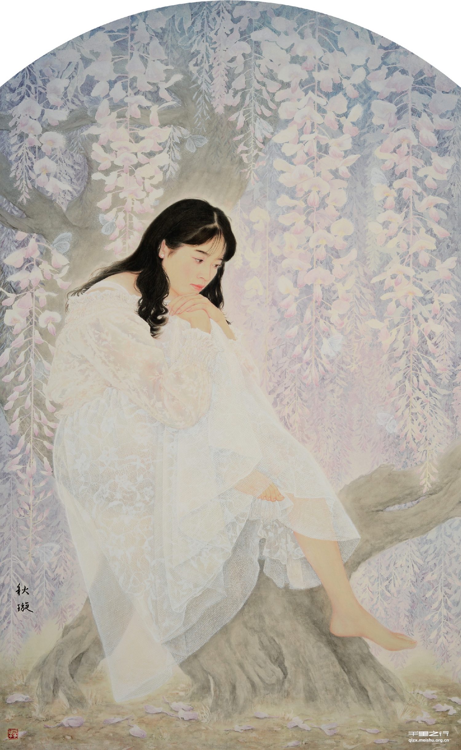 《四季歌•舂》描绘的是一幅在紫藤花瀑布下,若有所思的白裙少女的画面。作品以青年人与应季花卉植物为主,创作出发点源于《诗经》中对美丽女子和爰情的描写,基于自己对于人物工笔画的绘画追求,在人物的造型、神态和画面形式上加以探究,整个画面在写实的基础上强调中国画的造境,用兼工带写的形式,运用不同的肌理来丰富画面,通过描绘自然客观主体来表达自己对于“美”的理解。
