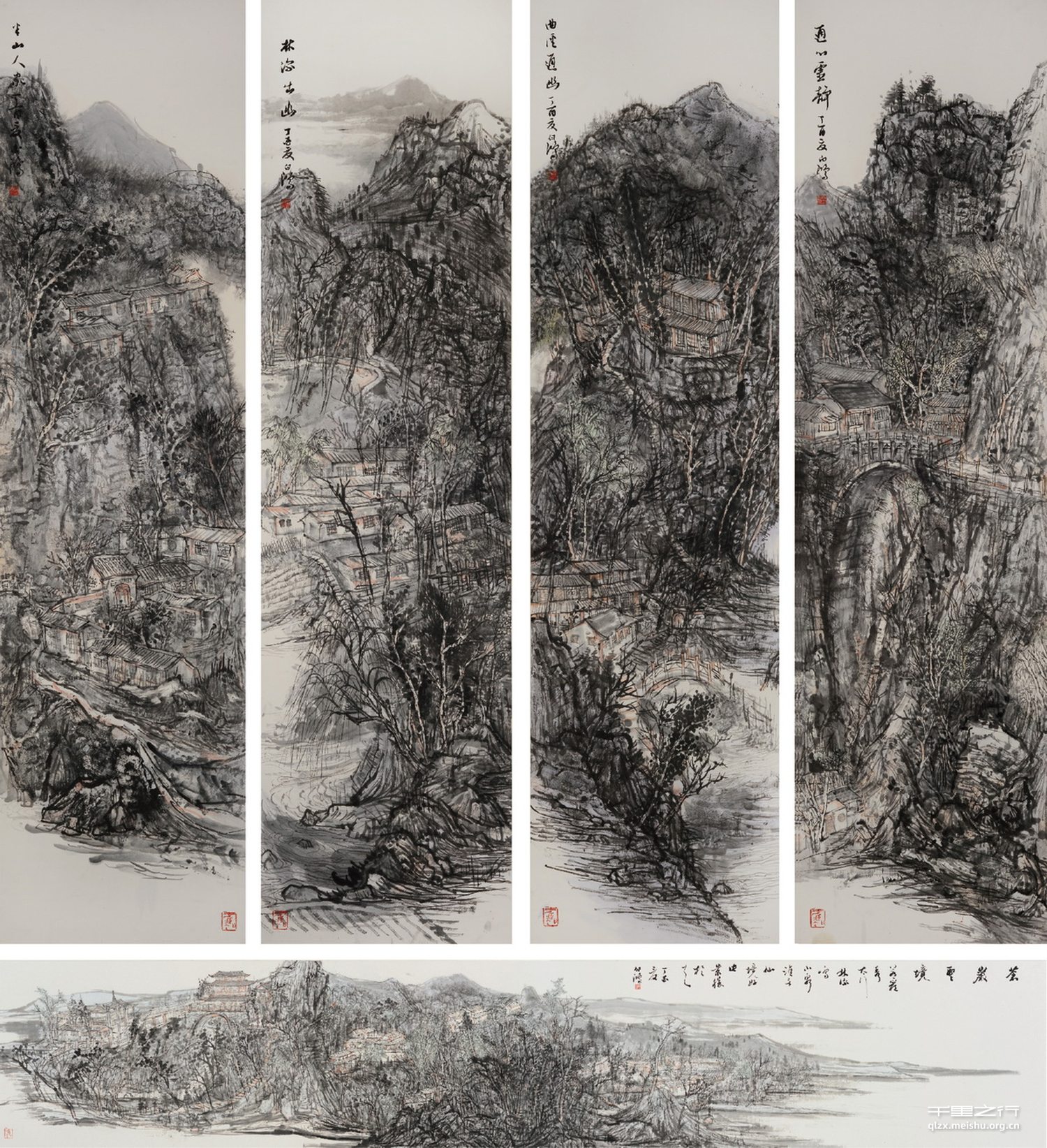 艺术形象不能像现实物象一样随意坐落,结合自己的画面对自然进行筛选组合,形成自己的艺术形象,进而研究物象如何转为画面形象。此作品通过对山石、树木、房屋等物象进行有秩序的组合,不完全拘泥客观现实,近而探索画面形象的艺术语言。树是好用的物象,本作品采用了大量的树,将树作线,作白形也作黑形,以线的丰富性添充画面,进而感受线条的魅力。“通心”即“通桥”,欲要上桥就要历尽艰难攀登险山,这样才能通达宝殿,以致灵静。整幅画仍然探索如何将客观现实转为艺术形象。绘画不是简单的描述,而是一个客观再现的过程。这幅作品是当我游苍岩山,看到大山一瞬间的感受与心产生共鸣而得到的对应物。从小生长在大山,人往往最熟悉的事物是最容易忽略的,所以这次创作重新走进大山亲近它观察它感受它的气质与精神,表达我对故乡大山的最真诚的热爰!