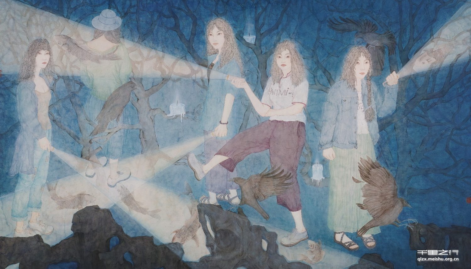 《寻•觅》的创作是我经过多次反思与探索之后的一次尝试,在此之前创作过几张人物画,数量不多,不过尺幅都偏大,对人物画创作也有了一定的熟悉。毕业创作这张作品是大学几年学习生活的总结和对未来新的艺术道路的探索,这几个月很用心地在画,不断纠结考虑画面各种可能性,期间不断的尝试和实验也让我有了许多心得,在自身的艺术道路上前进了一大步。我本身性格就喜静,喜欢捕捉生活中容易被人忽视的一些人、事、物,因此在这幅画面中,选择了夜晚这样一个背景环境的原因。我比较注重画面氛围的表达,喜欢用特殊环境来衬托出画面中心的主要人物,借此传达我内心深处向往的安静舒适的生活。