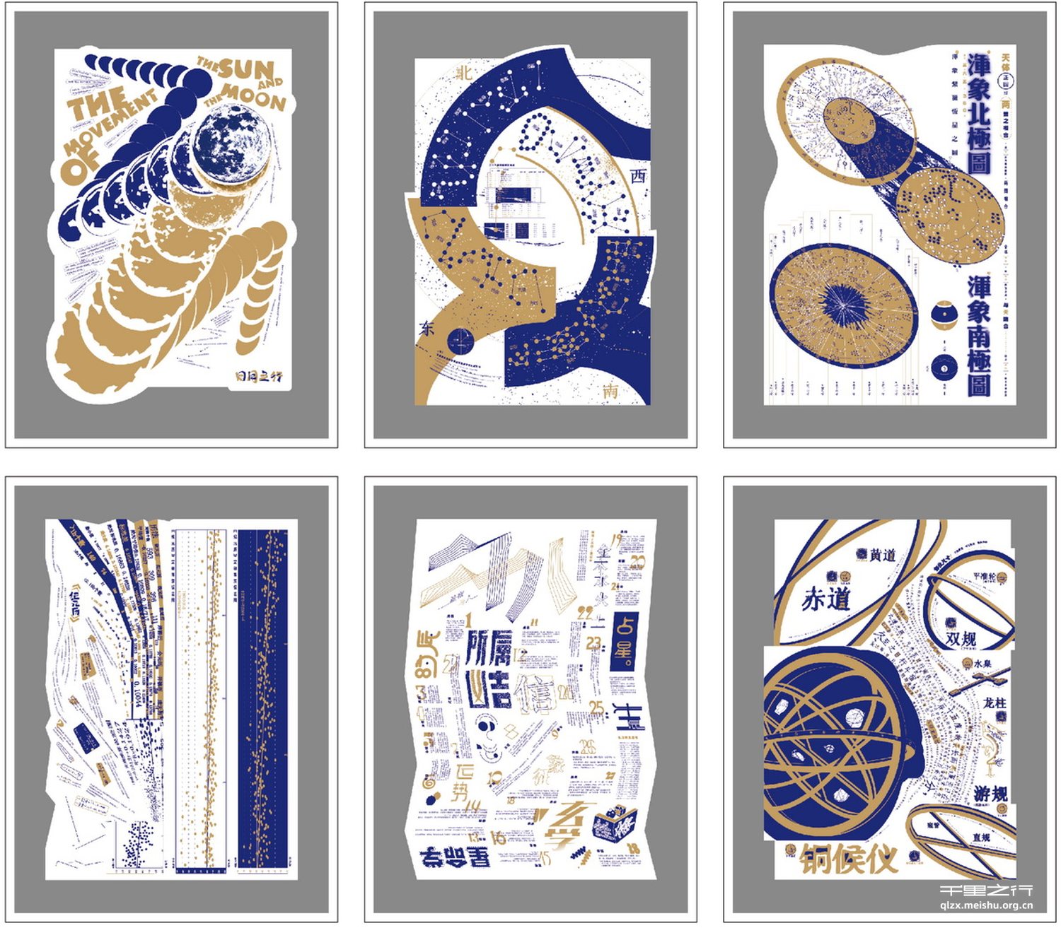 以“渐变、聚集、旋转、反复、漫延、分解”六个动词来表现主题内容。日月之行:运用渐变的方式来表现日与月渐渐相遇的过程。日月定朔:定朔误差有函数曲线趋势,点聚集在曲线附近,是理智的美。二十八宿:用旋转来反映四个方位的循环解读。星宿与人:用反复来表现二十八宿规律和轮回的特性,有着给人借鉴的文字。浑象:从地球延伸出去天球的两极,漫延分布着所有的星体。浑仪之变:将混仪的部件全部拆开解读,整体构图有一个分散开来的动势。