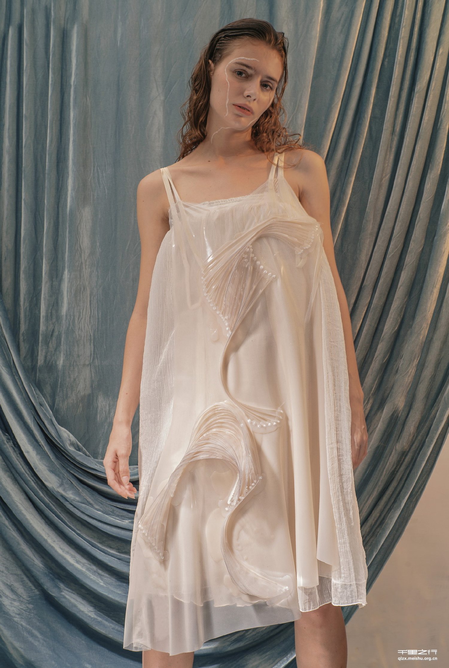 该生作品的最终效果较好,极具创新感和实验意义,材料和手法方面比较新颖,将平面的传统纹样转化为通透立体结构关系。而最终通过建模和激光切割技术裁出裁片也很有创新意义,整体的服装并不高调,但其视觉冲击力和艺术感极其丰富。唯一值得加强的是对于观看方式和保存方式的考究,需要更加长远的设计考量。